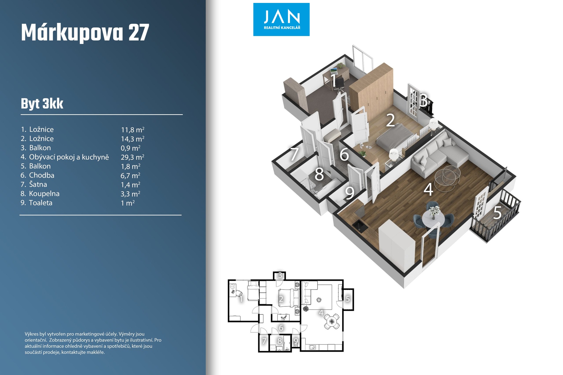 Útulný byt 3+kk s šatnou 66 m² s balkony celkem 3 m² plus garážové stání – klidné bydlení v Horních Počernicích. Hledáte místo, kde se budete každý den těšit domů? Nabízíme prodej útulného a světlého bytu 3+kk s šatnou, dvěma malými balkony a sklepem, který se nachází v posledním, třetím patře menšího domu bez výtahu z roku 2017. Součástí nabídky je také garážové stání v hodnotě 400 000,- Kč, které není zahrnuto v ceně bytu a je určeno ke koupi společně s ním. Díky tomu máte jistotu pohodlného a bezpečného parkování přímo v domě. Co vás nadchne: • příjemně řešený prostor bytu se šatnou a dvěma balkony, kde si vychutnáte ranní kávu nebo večerní sklenku vína • koupelna s vanou a samostatná toaleta – ideální pro rodinný život • světlý interiér s plovoucími podlahami, který si snadno doladíte podle svého stylu • sklep jako praktický úložný prostor • garážové stání přímo v domě Okolí, kde se dobře žije: • pár minut pěšky na autobus, který vás za 10 minut doveze k metru Černý Most nebo na vlak • supermarket, škola, školka i lékárna v docházkové vzdálenosti • příroda na dosah – les, cyklostezky i místa pro procházky s dětmi nebo sportovní vyžití Byt spojuje pohodlí moderního bydlení, klid menšího domu a skvělou dostupnost do centra Prahy. Pokud hledáte domov, kde najdete rovnováhu mezi městem a přírodou, toto je vaše příležitost.