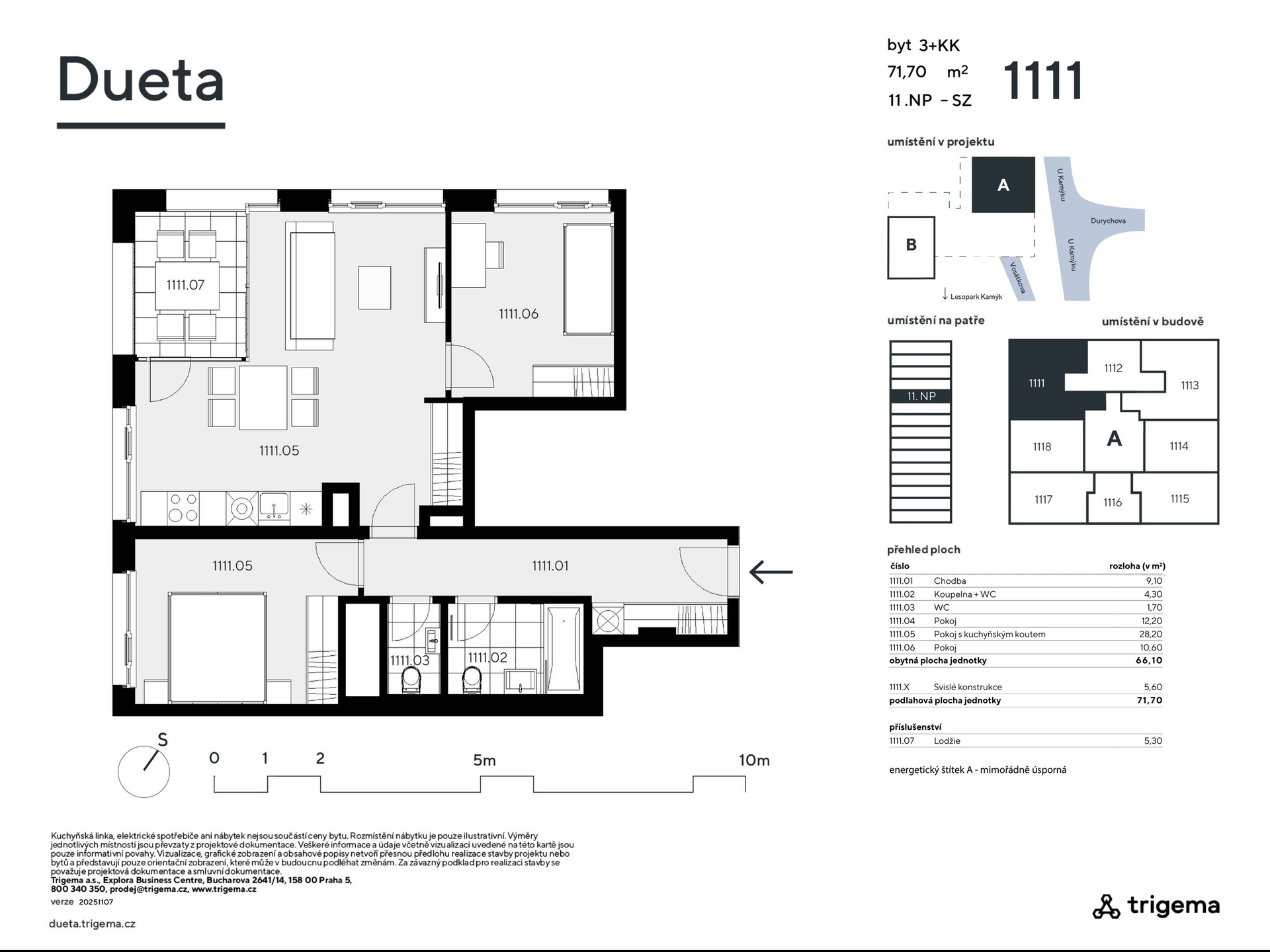 Byt č. 1111: Prostorné 3+kk s lodžií Výstavba zahájena – 40 % bytů prodáno během 6 měsíců! Neváhejte s výběrem – právě teď máte možnost zvolit si ideální dispozici i orientaci bytu v atraktivním projektu Dueta Kamýk, který spojuje moderní bydlení s přírodou Byt č. 1111 o dispozici 3+kk a celkové podlahové ploše 71,70 m² se nachází v 11. nadzemním podlaží a je orientován na severozápad. Dispozici tvoří prostorný obývací pokoj s kuchyňským koutem (28,20 m2), dvě samostatné ložnice, chodba, koupelna s WC a samostatné WC. Obytná plocha činí 66,10 m² doplněná o svislé konstrukce a konstrukční prvky. Lodžie 5,30 m2 s výhledem na dvě světové strany. • Dispozice 3+kk s oddělenými ložnicemi • Velkorysá hlavní obytná místnost • Dvě toalety – komfort pro vícečlennou domácnost • Energetická třída A – mimořádně úsporná Vhodné pro: Rodiny s dětmi nebo páry, které hledají prostorné a funkční bydlení s důrazem na pohodlí. Projekt Dueta Kamýk přináší jedinečnou kombinaci klidného bydlení uprostřed přírody a skvělé dostupnosti do centra Prahy díky plánované trase metra D. Lokalita nabízí nejen blízkost lesoparku a rozsáhlé zeleně, ale i atraktivní výhledy, které ocení každý milovník přírody. Byty jsou vybaveny nadstandardními technologiemi – rekuperací, podlahovým vytápěním, předokenními žaluziemi a kvalitními materiály, které zaručují pohodlí i úsporný provoz. Dueta Kamýk je ideálním řešením jak pro vlastní bydlení, tak jako chytrá investice v rychle se rozvíjející lokalitě.