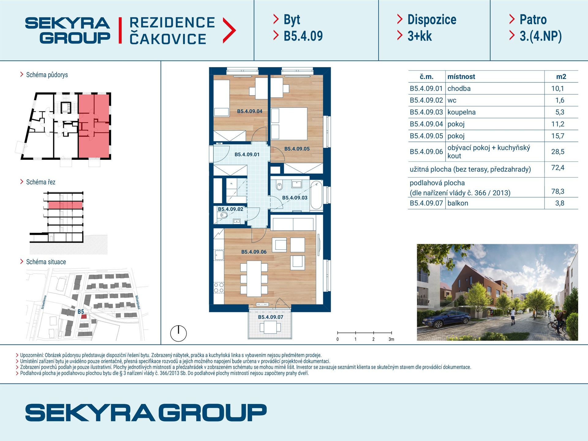 Dovolujeme si Vám nabídnout k prodeji byt 3+kk o výměře 78,3 m² s balkónem 3,8 m² v rezidenčním projektu Rezidence Čakovice, etapa B Klidné bydlení 5 obytných domů projektu Rezidence Čakovice poskytuje moderní byty s kvalitně nastavenými standardy bydlení o dispozicích od 1+kk až po 4+kk, součástí Rezidence Čakovice bude multifunkční dům se školkou, ordinacemi a ubytovacími jednotkami. Aby přirozeně zapadly do okolní zástavby, samotné domy jsou koncipovány jako tří až pětipodlažní. Řada bytů bude disponovat vlastní zahrádkou či balkonem. Samozřejmostí jsou parkovací místa a garáže. S původní zástavbou novou rezidenci propojí příjemné uličky lemované alejemi, které plynule navážou na stávající ulice. K oddychu a rekreaci obyvatel bude sloužit i přilehlý „zelený“ prostor s trávou a stromy, jenž bude realizován v rámci výstavby projektu. Čakovice mají dlouhou a barvitou historii. Suverénní městečko se stalo součástí Prahy v roce 1968, zachovalo si však svůj genius loci. Místní kulturní památkou je novorománský kostel sv. Remigia postavený podle plánů Karla Scheinera a zámek Čakovice, který se nachází v blízkosti čakovického cukrovaru, a mezi nimi se rozprostírá anglický park. V těsném sousedství budoucí Rezidence Čakovice je i potok, rybník nebo zámecký park, což jen podtrhuje komorní a příjemnou atmosféru bydlení.