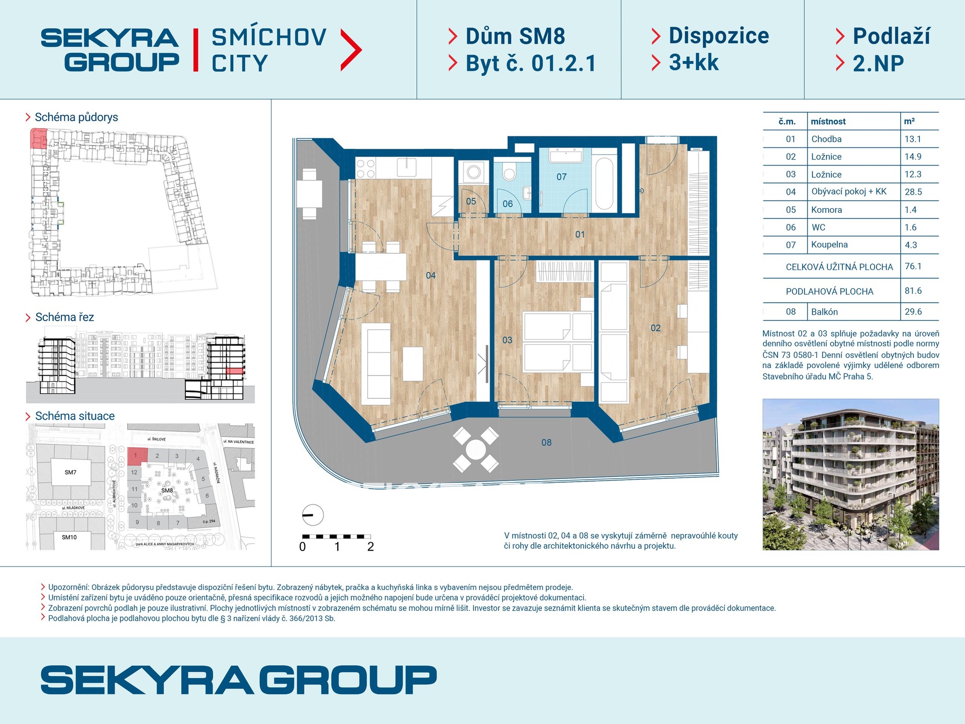 Dovolujeme si Vám nabídnout k prodeji byt 3+kk o výměře 81,6 m² s balkónem 29,6 m² v rezidenčním projektu Smíchov City, blok SM8. K bytu je možné přikoupit 1 parkovací stání. V ceně bytu je podlahové topení, předokenní žaluzie a příprava na dochlazování. SM8 navazuje na již realizované rezidenční bloky SM1/2 a SM3 a zahrnuje celkem 12 bytových domů. Je součástí projektu Smíchov City, jehož záměrem je nabídnout obyvatelům moderní bydlení s vysokým standardem provedení, vybavené špičkovými technologiemi. Nespornou výhodou je navíc umístění v centru města. Exkluzivní byty doplní v přízemí objektů funkční městský parter s obchody a službami. V ulicích budou vysázeny stromy, které zpříjemní klima a v horkých dnech poskytnou chladivý stín. Blok sousedí s třídou Madeleine Albrightové pojatou jako pěší podélný park a budoucím parkem Alice a Anny Masarykových. Byty v bloku SM8 jsou navrženy tak, aby si podle svých preferencí a možností mohl vybrat opravdu každý. Dispozičně tu naleznete vše – od malých bytů 1+kk až po velké byty kategorie 5+kk s nádhernými výhledy na Prahu. Samozřejmostí je dostatek parkovacích míst, technické zázemí a sklepní kóje v suterénu objektu. V posledním podlaží jsou pak ty nejexkluzivnější byty, z nichž některé nabízí jedinečný pohled na Vyšehrad. Všechny byty jsou navrženy ve vysokém standardu, což se týká povrchových materiálů i zařízení, jako je podlahové topení či vzduchotechnika s rekuperací vzduchu. Standard bytů lze samozřejmě přizpůsobit potřebám budoucích majitelů. Stačí se obrátit na naše prodejce.