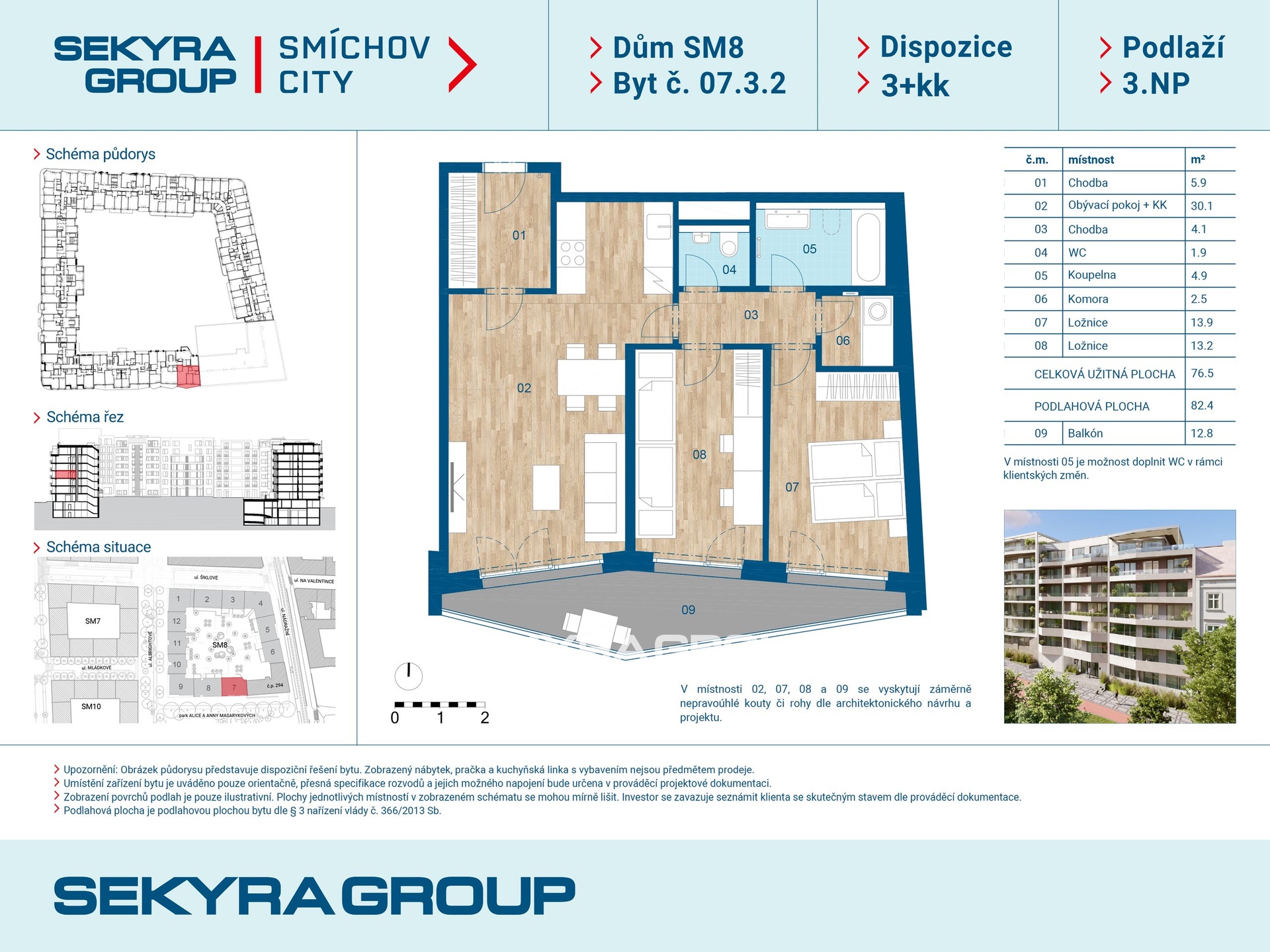 Dovolujeme si Vám nabídnout k prodeji byt 3+kk o výměře 82,4 m² s balkónem 12,8 m² v rezidenčním projektu Smíchov City, blok SM8. K bytu je možné přikoupit 1 parkovací stání. V ceně bytu je podlahové topení, předokenní žaluzie a příprava na dochlazování. SM8 navazuje na již realizované rezidenční bloky SM1/2 a SM3 a zahrnuje celkem 12 bytových domů. Je součástí projektu Smíchov City, jehož záměrem je nabídnout obyvatelům moderní bydlení s vysokým standardem provedení, vybavené špičkovými technologiemi. Nespornou výhodou je navíc umístění v centru města. Exkluzivní byty doplní v přízemí objektů funkční městský parter s obchody a službami. V ulicích budou vysázeny stromy, které zpříjemní klima a v horkých dnech poskytnou chladivý stín. Blok sousedí s třídou Madeleine Albrightové pojatou jako pěší podélný park a budoucím parkem Alice a Anny Masarykových. Byty v bloku SM8 jsou navrženy tak, aby si podle svých preferencí a možností mohl vybrat opravdu každý. Dispozičně tu naleznete vše – od malých bytů 1+kk až po velké byty kategorie 5+kk s nádhernými výhledy na Prahu. Samozřejmostí je dostatek parkovacích míst, technické zázemí a sklepní kóje v suterénu objektu. V posledním podlaží jsou pak ty nejexkluzivnější byty, z nichž některé nabízí jedinečný pohled na Vyšehrad. Všechny byty jsou navrženy ve vysokém standardu, což se týká povrchových materiálů i zařízení, jako je podlahové topení či vzduchotechnika s rekuperací vzduchu. Standard bytů lze samozřejmě přizpůsobit potřebám budoucích majitelů. Stačí se obrátit na naše prodejce.