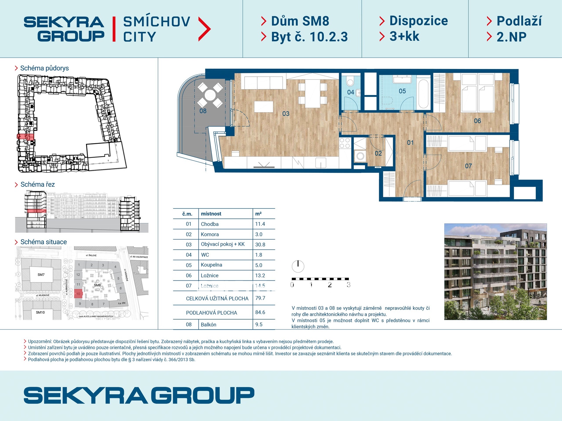Dovolujeme si Vám nabídnout k prodeji byt 3+kk o výměře 84,6 m² s balkónem 9,5 m² v rezidenčním projektu Smíchov City, blok SM8. K bytu je možné přikoupit 1 parkovací stání. V ceně bytu je podlahové topení, předokenní žaluzie a příprava na dochlazování. SM8 navazuje na již realizované rezidenční bloky SM1/2 a SM3 a zahrnuje celkem 12 bytových domů. Je součástí projektu Smíchov City, jehož záměrem je nabídnout obyvatelům moderní bydlení s vysokým standardem provedení, vybavené špičkovými technologiemi. Nespornou výhodou je navíc umístění v centru města. Exkluzivní byty doplní v přízemí objektů funkční městský parter s obchody a službami. V ulicích budou vysázeny stromy, které zpříjemní klima a v horkých dnech poskytnou chladivý stín. Blok sousedí s třídou Madeleine Albrightové pojatou jako pěší podélný park a budoucím parkem Alice a Anny Masarykových. Byty v bloku SM8 jsou navrženy tak, aby si podle svých preferencí a možností mohl vybrat opravdu každý. Dispozičně tu naleznete vše – od malých bytů 1+kk až po velké byty kategorie 5+kk s nádhernými výhledy na Prahu. Samozřejmostí je dostatek parkovacích míst, technické zázemí a sklepní kóje v suterénu objektu. V posledním podlaží jsou pak ty nejexkluzivnější byty, z nichž některé nabízí jedinečný pohled na Vyšehrad. Všechny byty jsou navrženy ve vysokém standardu, což se týká povrchových materiálů i zařízení, jako je podlahové topení či vzduchotechnika s rekuperací vzduchu. Standard bytů lze samozřejmě přizpůsobit potřebám budoucích majitelů. Stačí se obrátit na naše prodejce.