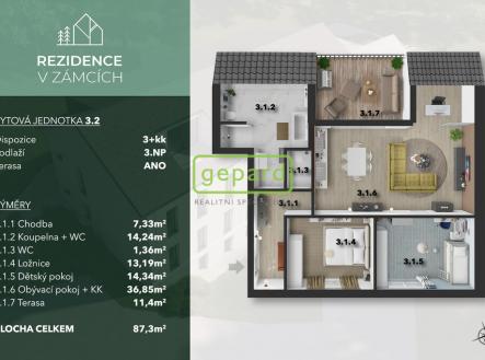 Nízkoenergetický byt (89,9 m2) s terasou (11,5 m2) v projektu Rezidence V Zámcích, Praha 8 je nyní k prodeji! Byt se nachází v posledním 3. nadzemním podlaží a disponuje vstupní halou, odkud se vchází do dalších místností: obývací pokoj, ložnice, koupelna, a oddělené WC. Z obývacího pokoje je vstup do 2. ložnice a také na terasu, která nabízí dech beroucí výhled na řeku a přírodu. V celém bytě najdete mnoho nadstandardních prvků, jako je např. klimatizace a podlahové vytápění, což zaručuje spolu s tepelným čerpadlem velmi nízké náklady na provoz bytu. V koupelně se nachází místo pro pračku i sušičku, závěsné WC, vana a sprchový kout. Obě ložnice a předsíň pak nabízejí celou stěnu pro případné vložení vestavěné skříně pro maximalizaci úložného prostoru. K bytu lze dokoupit sklep a parkovací stání. Rezidence V Zámcích je výjimečný komorní projekt o pouhých 10 bytových jednotkách, který spojuje městské bydlení v přírodě. První tři prodané byty mají sklep zdarma! Vizualizace a video odpovídají půdorysu této bytové jednotky. Fotografie jsou pořízeny ve vzorové bytové jednotce Rezidence V Zámcích. Pro více informací či při zájmu o prohlídku mě prosím neváhejte kontaktovat.