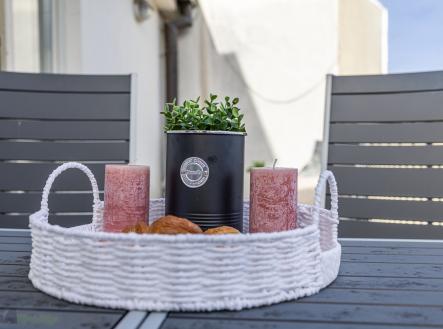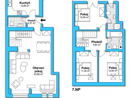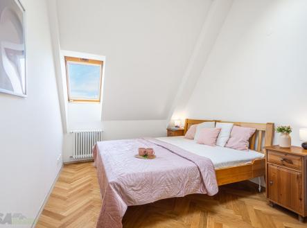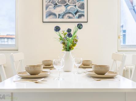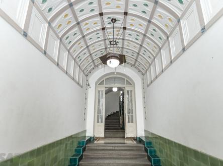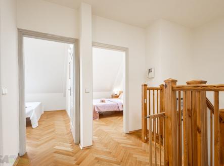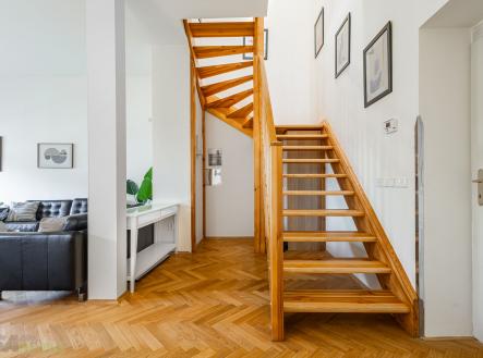 Mezonetový byt v osobním vlastnictví o dispozici 4+1, podlahová plocha 120,3m², terasa 10,5m², umístěný v 6. a 7. podlaží historického nárožního domu v ulici Valentinská, Praha 1 - Josefov. Nemovitost je ideální volbou pro ty, kteří hledají reprezentativní bydlení v centru města, v klidné ulici, pouhých pár kroků od nábřeží řeky Vltavy, Pařížské ulice a Staroměstského náměstí v secesním domě s recepcí (24/7) a výtahem. Dům, postavený v roce 1908, je významným příkladem secesní architektury. Jeho hodnota spočívá v tom, že si dodnes zachoval téměř původní vybavení. Budovu navrhl renomovaný architekt Bedřich Bendelmayer, což ještě zvyšuje její historický význam. Interiér domu se pyšní bohatou výzdobou – keramickými obklady, plastickými štukovými prvky, vitrážemi, původním lustrem, zábradlím a zejména unikátní výtahovou klecí a kabinou, která je zdobená perleťovými intarziemi a broušenými sklíčky. Byt je ve velmi dobrém a udržovaném stavu. Stejně jako celý dům prošel kvalitní a citlivou rekonstrukcí, která probíhala pod dohledem italského architekta. Dispozice bytu: 1.podlaží předsíň, obývací pokoj, kuchyň, toaleta, 2.podlaží: předsíň, tři ložnice, dvě koupelny s WC a terasa. Vybavení, které je součástí bytu: kuchyňská linka včetně spotřebičů (varná deska, trouba, myčka, lednice, digestoř). Veškerá občanská vybavenost se nachází v místě. Před domem je stanice metra A Staroměstská. Zastávka tramvaje se nachází cca 200 m od domu. K bytu náleží sklepní kóje, která je umístěná v suterénu domu. Možnost financování koupě bytu hypotečním úvěrem.