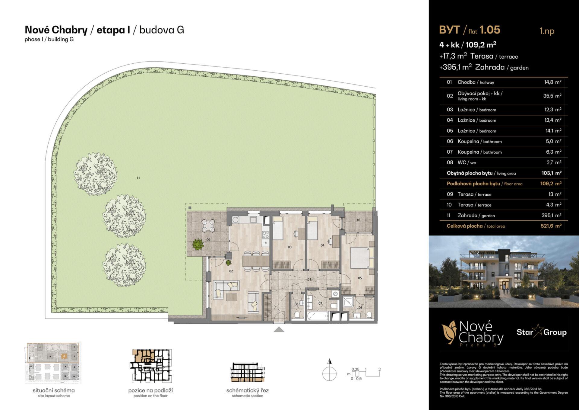 Moderní 4+kk s terasou 17,3 m² a zahradou 395,1 m² – nastěhování již letos! Hledáte domov, kde se můžete cítit bezpečně, a který zároveň disponuje kompletním zázemím pro pohodlný a klidný život? Tento byt 4+kk o velikosti 109,2 m² se nachází v 1. podlaží komorního viladomu a nabízí vše, co potřebujete – prostorný interiér, terasu o 17,3 m² a vlastní rozsáhlou zahradu o 395,1 m², kde si můžete užít chvíle zaslouženého odpočinku i rodinné pohody. Bytu byl nově navýšen standard provedení a pyšní se tak velkoformátovými obklady a dlažbou značky Savoia Italia a prémiovou sanitou značky Laufen. Navýšení standardu je zahrnuto v ceně bytu. Dispozice a vybavení: - byt 4+kk o velikosti 109,2 m² - terasa 17,3 m² a zahrada 395,1 m² - prémiový standard provedení: velkoformátové obklady a dlažba Savoia Italia, designová sanita Laufen (již v ceně bytu) - čtyři podlaží v domě – komorní atmosféra, klid a soukromí Další možnosti: - sklepní kóje k dokoupení (od 41.500 Kč/m² vč. DPH) - garážové stání v podzemí (520.000 Kč vč. DPH) – parkovací stání není podmínkou koupě bytu Lokalita a projekt: Byt je součástí projektu Nové Chabry, jedné z nejoblíbenějších rezidenčních lokalit v Praze. Projekt nabízí nejen moderní a bezpečné bydlení, ale i kompletní zázemí přímo v areálu – mateřskou školu, italskou restauraci, bistro, vinotéku, obchody, fitness, komunitní centrum i výdejní boxy e-shopů. Základní škola je vzdálena jen 10 minut klidné pěší chůze. Pro volný čas poslouží cyklostezky, venkovní posilovna a dětská hřiště. V okolí pak najdete Ďáblický háj, Čimické a Drahanské údolí i oblíbené aquacentrum Šutka. Dopravní dostupnost: Do centra Prahy se dostanete autem za 15 minut nebo autobusem za 5 minut na metro C – Kobylisy. V blízké budoucnosti přibude také nová tramvajová zastávka jen pár minut od projektu. Na stavbě již probíhají dokončovací práce, svůj nový domov si tedy můžete převzít v polovině roku 2026. *Zařízení interiéru na fotografiích a vizualizacích je pouze ilustrativní.*