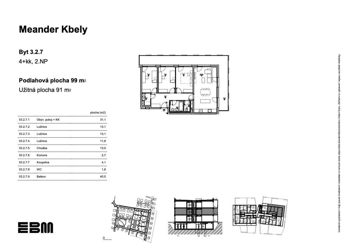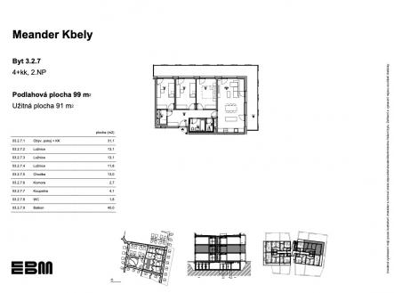 Vstupte do nového domova Meander Kbely, kde se nachází byt 3.2.7 o podlahové ploše 99 m2 – místo, které spojuje moderní architekturu, útulnost a harmonii s přírodou. V projektu se nachází 96 bytů o dispozicích od 1+kk až po prostorné 4+kk. Projekt nese své jméno po meandru nedalekého potoka, jehož klidný rytmus se promítl do architektonického řešení. Budovy jsou zasazeny do zeleně, nabízejí otevřené prostory a přirozené splynutí s okolní krajinou – ideální prostředí pro klidný život i aktivní odpočinek. Kbely jsou čtvrtí, kde se snoubí výborná dostupnost s každodenním komfortem. Díky kompletní občanské vybavenosti, infrastruktuře a rychlému spojení do centra Prahy je tato lokalita ideální volbou pro rodiny, páry i jednotlivce. Objevte bydlení, kde se dynamika velkoměsta setkává s klidnou atmosférou přírody. Váš nový životní rytmus začíná v Meander Kbely. Navštivte webové stránky developera projektu EBM Group pro více informací.