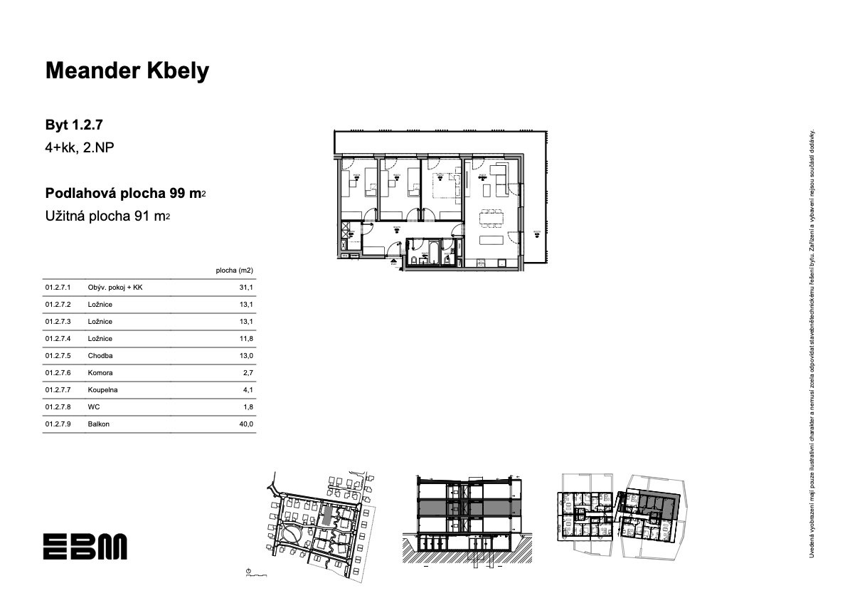 Vstupte do nového domova Meander Kbely, kde se nachází byt 1.2.7 o podlahové ploše 99 m2 – místo, které spojuje moderní architekturu, útulnost a harmonii s přírodou. V projektu se nachází 96 bytů o dispozicích od 1+kk až po prostorné 4+kk. Projekt nese své jméno po meandru nedalekého potoka, jehož klidný rytmus se promítl do architektonického řešení. Budovy jsou zasazeny do zeleně, nabízejí otevřené prostory a přirozené splynutí s okolní krajinou – ideální prostředí pro klidný život i aktivní odpočinek. Kbely jsou čtvrtí, kde se snoubí výborná dostupnost s každodenním komfortem. Díky kompletní občanské vybavenosti, infrastruktuře a rychlému spojení do centra Prahy je tato lokalita ideální volbou pro rodiny, páry i jednotlivce. Objevte bydlení, kde se dynamika velkoměsta setkává s klidnou atmosférou přírody. Váš nový životní rytmus začíná v Meander Kbely. Navštivte webové stránky developera projektu EBM Group pro více informací.