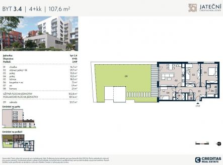 Dovolujeme si vám nabídnout byt 4+kk o celkové výměře 107,6 m² se zahradou 121,7 m2, umístěný ve 3.NP, který je součástí projektu Jateční 35 v samém srdci Holešovic. Projekt nabízí soukromí menšího rezidenčního domu, každý z bytů je ukázkou nadčasového a minimalistického designu a architektury. Jedná se o moderní bydlení v centru města ve vysokém standardu s kompletní občanskou vybaveností v blízkosti zeleně a řeky. Holešovice svým obyvatelům nabízí nejen perfektní dopravní spojení v rámci metropole, ale také bezproblémový přístup k široké paletě kulturních, společenských a rekreačních aktivit. Ať už je vaším cílem prozkoumat rozmanitou nabídku místních galerií, navštívit trendy kavárny a restaurace nebo se jednoduše ponořit do klidu rozlehlých parků a nábřeží Vltavy, Holešovice vás osloví svou širokou nabídkou možností a svojí typickou atmosférou. Projekt má šest nadzemních podlaží a nabízí celkem 39 jednotek s dispozicemi 1+kk až 4+kk s balkóny, lodžiemi a prostornými zahradami, které jsou situovány do vnitrobloku domu. V prvním podzemním podlaží se nachází 35 parkovacích stání a sklepy. V přízemí domu se nachází komerční jednotka. Dokončení projektu 4.Q 2026. K bytu je možné přikoupit garážové stání či sklep. Jednotková cena garážového stání je 890 000 Kč bez DPH, cena stání v zakladači 590 000 Kč bez DPH. Cena sklepu je dle velikosti, jednotková cena je 50 000 Kč/m2 bez DPH. V případě zájmu nás neváhejte kontaktovat. Prodej přímo od majitele. Více informací o tomto bytu a kompletní nabídce najdete na webu creditasre.