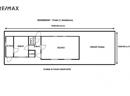 Hledáte netradiční způsob bydlení či rekreace a láká Vás život na vodě? Nebo Váš život směřuje nezávislým a alternativním směrem? Právě pro takové zájemce si exkluzivně dovolujeme nabídnout ke koupi houseboat / mobilní dům k dokončení podle svých představ. Objekt byl původně tankovací stanicí, nicméně před pár lety započala postupně přestavba na obytný prostor. Houseboat je nyní umístěn v přístavu v Praze 7 - Holešovicích. Užitná plocha je 45 m2 a v současné době tvoří dispozici velká obytná místnost o výměře 25,2 m2, menší pokoj o výměře 8,8 m2, technická místnost o výměře 4,7 m2, toaleta se sociálním zařízením o výměře 1,7 m2, komora o výměře 1,2 m2 a chodba o výměře 3,4 m2. Dispozici a výměru místností lze v rámci úprav a dokončení měnit, do původního objektu byla osazena okna, ale i jejich umístění lze jednoduše přizpůsobit. Původní tloušťka plechu byla 1 cm, před samotným prodejem bude ještě aktuální tloušťka zkontrolována, aby byla splněna podmínka pro umístění na vodě (tloušťka musí být 3 mm). Samotná obytná část stojí na železném pontonu o rozměrech 18,7 m x 4,5 m a celkově je tak výměra houseboatu téměř 85 m2. V neobytné části (přední terase) je možné vybudovat posezení nebo třeba i zapuštěný malý bazén či vířivku. V rámci obytné části byla rozvedena elektřina, připraven odpad a rozvody vody. V podpalubím prostoru jsou umístěny 3 nádrže na vodu, každá o objemu 1000 litrů. Další je v současné době umístěna na střeše, ale i tuto plochu (terasu) je možné nechat přebudovat k dalšímu využití (posezení, vířivka, případně prostor pro spaní či umístění solárních panelů apod.). Jedná se čistě o obytný houseboat, bez motoru, pro případný přesun v rámci lodní přepravy je nutné využít odtah. S koupí houseboatu je spojena i možnost přepisu kotvícího místa, jehož pronájem stojí měsíčně 3.000 Kč + DPH. V případě zájmu je možné budoucímu majiteli zajistit návrh designu interiéru od oceňovaného architektonického studia. Pokud hledáte netradiční způsob bydlení či rekreace a láká Vás život na vodě či Váš život směřuje nezávislým a alternativním směrem, může být pro Vás tento typ bydlení tím pravým. Pro domluvení prohlídky či v případě dalších dotazů mne neváhejte kontaktovat.