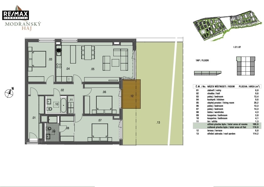 Ráda bych Vám představila výjimečný byt 4+kk o užitné ploše 118,4 m², který Vás na první pohled okouzlí svou atmosférou, promyšleným dispozičním řešením a pocitem domova. Díky důmyslnému řešení působí celý byt mimořádně prakticky a útulně zároveň. Byt se nachází se v klidné a malebné části Komořan, v komorním domě s pouhými čtrnácti bytovými jednotkami, a díky umístění v posledním podlaží nabízí soukromí, klid a nádherný výhled do zeleně. Součástí bytu je soukromá, pečlivě udržovaná zahrada s velkorysou terasou, která přímo vybízí k posezení s kávou, grilování s přáteli nebo odpočinku po náročném dni. Obývací pokoj i obě ložnice mají vlastní vstup na terasu a do zahrady. Dominantou bytu jsou velkoformátová francouzská okna, díky nimž je celý prostor krásně prosvětlený a působí útulně a vzdušně. Za vstupem Vás přivítá prostorná chodba s místem pro šatní skříň, naproti které se nachází klidná pracovna.. Po pravé straně najdete koupelnu s vanou. Srdcem bytu je prostorný obývací pokoj s kuchyňským koutem o výměře téměř 40 m². Kuchyňská linka o délce přes čtyři metry nabízí dostatek prostoru pro vaření i ukládání věcí, a je vybavena kvalitními spotřebiči značky Electrolux – indukční varnou deskou, digestoří, lednicí s mrazákem, mikrovlnnou troubou i myčkou. Okno v kuchyni poskytuje příjemný výhled do zeleně sousedních zahrad, takže i každodenní vaření se stává radostí. Z obývacího pokoje vedou dva samostatné vstupy na terasu o výměře 20 m², odkud je přímý vstup na zahradu se vzrostlými keři a stromy, které zaručují naprosté soukromí. Centrální zatravněná část přímo vybízí k odpočinku, pikniku či hrám dětí. Na zahradě je k dispozici elektrická zásuvka i připojení na vodu. V bytě se dále nachází dvě samostatné ložnice – hlavní ložnice má vlastní koupelnu se sprchovým koutem, což dodává bytu ještě větší komfort. Na chodbě je prostor pro pračku a sušičku. Podlahy v obytných místnostech jsou pokryty plovoucí podlahou v dekoru dřeva, která dotváří teplo domova, v koupelnách a na chodbě je elegantní dlažba. K bytu náleží také prostorný sklep o velikosti 7,8 m² a garážové stání v 1. PP domu. Dům byl kolaudován v roce 2018 a plynule navazuje na původní zástavbu „starých“ Komořan, které si dodnes uchovaly svou poklidnou atmosféru. Pouhých pár kroků od domu se nachází vstup do lesa, odkud se příjemnou procházkou dostanete až na Točnou – místo ideální pro rodinné výlety, běh či cyklistiku. Dopravní dostupnost je skvělá – autobusové linky 139 a 117 Vás pohodlně dopraví do centra, a v pěší vzdálenosti se nachází vlakové nádraží s přímým spojením na Hlavní nádraží. V okolí najdete supermarket Billa, a jen pár minut jízdy autobusem se dostanete na Obchodní nebo Sofijské náměstí s veškerou občanskou vybaveností. ???? Pokud toužíte po bydlení, které spojuje klid přírody s pohodlím městského života, moderní architekturou a skutečným pocitem domova, pak je tento byt přesně tím místem, kde se budete cítit šťastní.