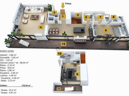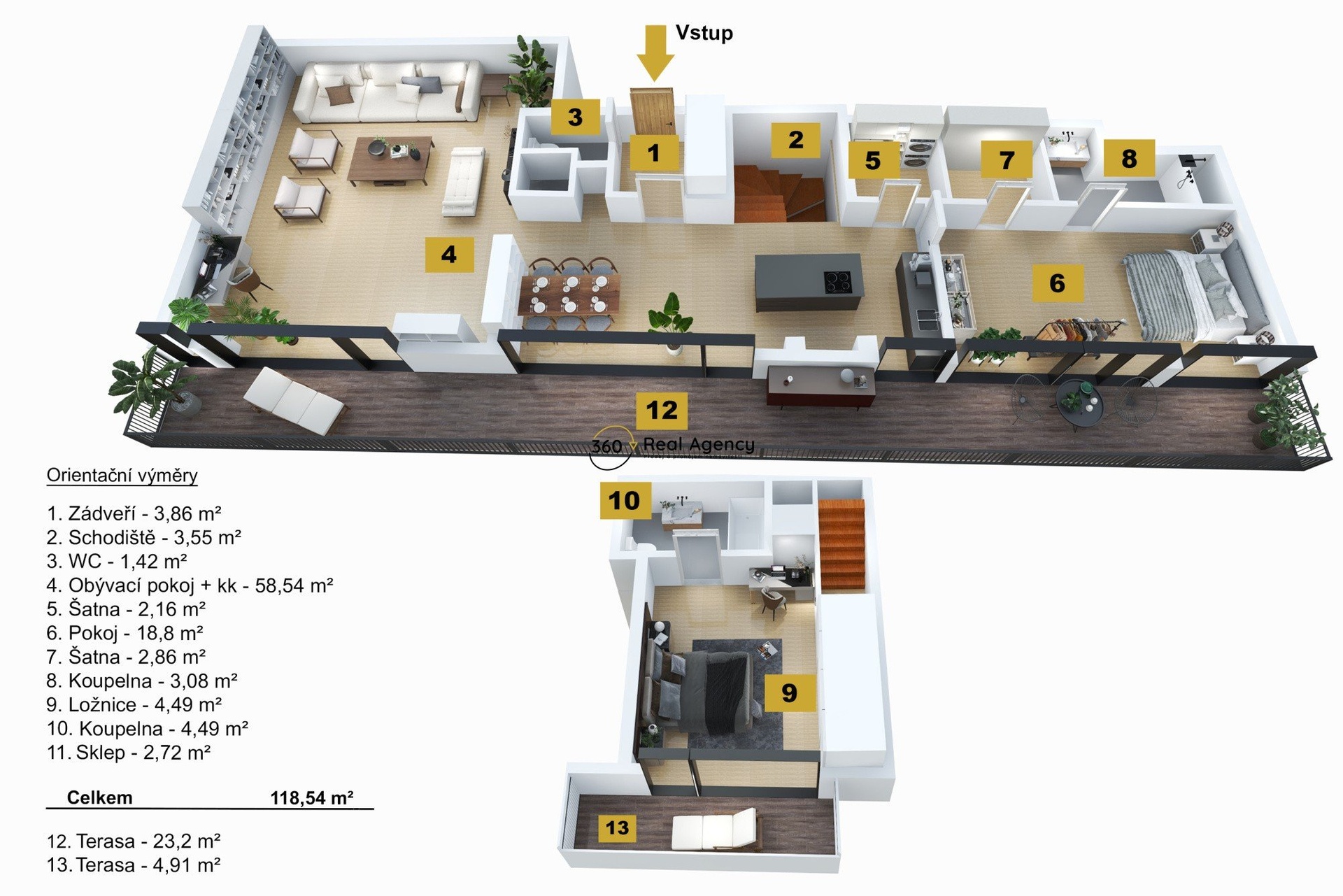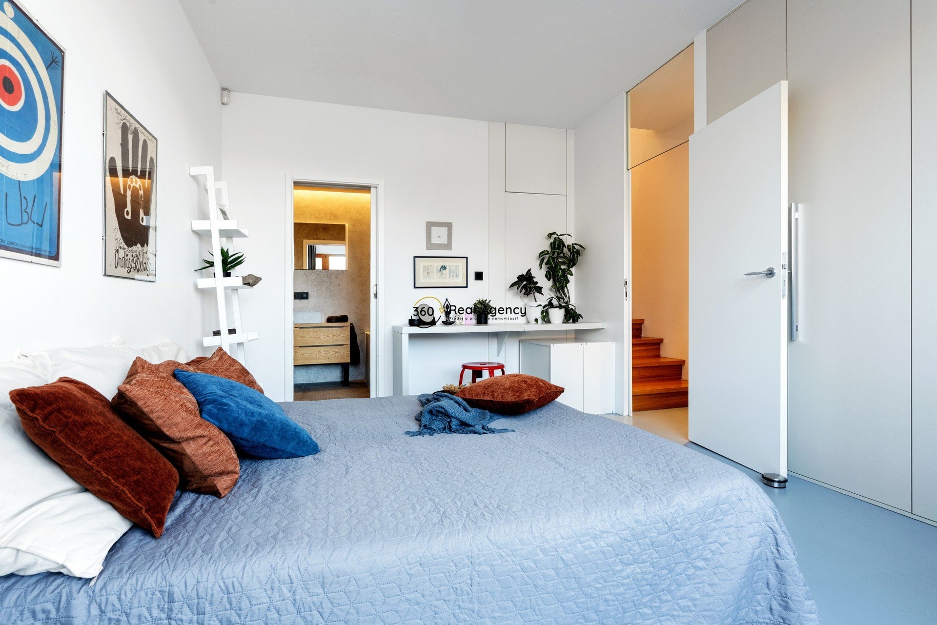 Nabízíme k prodeji výjimečný mezonetový byt o dispozici 3+kk, nacházející se v klidné části Prahy 5 – Košíře. Byt je ideální volbou pro rodinné bydlení nebo pro klienty, kteří hledají nadstandardní prostor, promyšlenou dispozici a kvalitní provedení v kombinaci s výbornou dostupností do centra města. Byt je rozložen do dvou úrovní, které přirozeně oddělují denní a klidovou část. Horní patro tvoří hlavní obytný prostor bytu – prostorný a světlý obývací pokoj s kuchyní, hlavní ložnice s vlastní koupelnou a samostatná toaleta umístěná hned u vstupu do bytu. Celý prostor působí velmi vzdušně a příjemně díky velkým oknům a otevřenému řešení. Z této úrovně je přístup na terasy, které přirozeně rozšiřují obytnou plochu a umožňují každodenní pobyt venku. Spodní patro nabízí další plnohodnotnou ložnici s vlastní koupelnou a toaletou. Součástí této úrovně je také samostatná terasa, která dává spodní ložnici vlastní venkovní prostor a vysokou míru flexibility – ideální řešení pro děti, hosty nebo kombinaci bydlení a práce. Byt prošel nedávnou kompletní rekonstrukcí a je proveden v nadčasovém a klidném stylu s důrazem na kvalitu a funkčnost. Součástí vybavení jsou dubové podlahy, kuchyně na míru, klimatizace, elektrické žaluzie a promyšlené úložné prostory. K bytu náleží praktický sklep umístěný v prvním patře domu, dvě garážová stání a samozřejmostí je výtah. Velkou předností je také samotná lokalita – v docházkové vzdálenosti se nachází parky a volnočasová zeleň, ideální pro rodiny i aktivní životní styl. Zároveň je zajištěno rychlé spojení na Anděl a do centra Prahy, a to během několika minut tramvají i autobusem. Byt je ideální volbou pro ty, kteří hledají kvalitní městské bydlení s promyšlenou dispozicí, venkovním prostorem a výbornou dostupností.