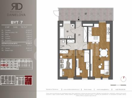 Dovolujeme si Vám nabídnout k prodeji byt 3+kk, 73 m2, s Terasou 18 m2, umístěné v 1. patře rezidenčního projektu Rezidence Danielova v samém srdci Čakovic. Byt je čerstvě po kolaudaci - Nová koupelna s vanou, WC samostatně, příprava na kuchyňskou linku, okna plastová, příprava na venkovní elektricky ovládané žaluzie, designové radiátory, bezpečnostní vchodové dveře, na podlahách kvalitní vinylová podlaha a dlažba. K bytu náleží terasa 18 m2, dvě venkovní parkovací stání a sklep. Občanská vybavenost (MHD, školy, obchody, lékaři) v docházkové vzdálenosti. Byt je v OV - možné financovat pomocí hypotečního úvěru. V inzerátu jsou fotografie momentálního stavu bytu a vizualizace ilustrativního charakteru.