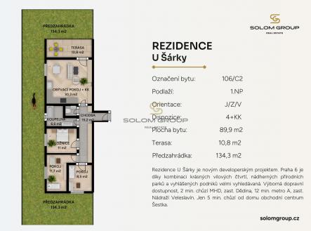Prodej nového bytu 4+kk o velikosti 89,8 m² + předzahrádka 134,3 m², terasa 10,8 m², sklep 4 m² , který se nachází v 1. NP cihlové novostavby v rezidenci U Šárky, Praha 6 – Ruzyně (dům C2). Jelikož se jedná o družstevní byt, neprokazujete výši příjmu, nepotřebujete hypoteční úvěr a cenu bytu splácíte formou splátek v měsíčních poplatcích („měsíční splátka anuity“). Byt Vám je předán hotový vč. zařízené kuchyňské linky vybavené spotřebiči (indukce, lednice s mrazákem, el. trouba, myčka nádobí, digestoř), včetně koupelny (umyvadlo, vana, WC, topný žebřík), samostatné WC s umyvadlem, dále interiérové dveře, plastová okna, vinylová podlaha a dlažba, nové rozvody vody, elektřiny a odpadů, protipožární vchodové dveře. Byt je zcela nový, nebydlený. Akontace za byt: 7.990.000 Kč Anuita k bytu: 7.250.679 Kč Akontace za garážové stání: 190.000 Kč Anuita garážové stání: 360.000 Kč Akontace za sklepní kóji: 70.000 Kč Anuita ke sklepní kóji: 131.550 Kč Možnost vložení mimořádné splátky či doplacení celé výše anuity a převedení bytu do osobního vlastnictví. Výborná dopravní dostupnost, 2 min. chůzí MHD, zast. Dědina, 12 min. metro A, zast. Nádraží Veleslavín. V blízkosti domu se nachází Obchodní centrum Šestka, Obora Hvězda nebo Divoká Šárka. Lokalita je vhodná jak k vlastnímu bydlení, tak za účelem pronajímání. K bytu přísluší garážové stání a sklep.