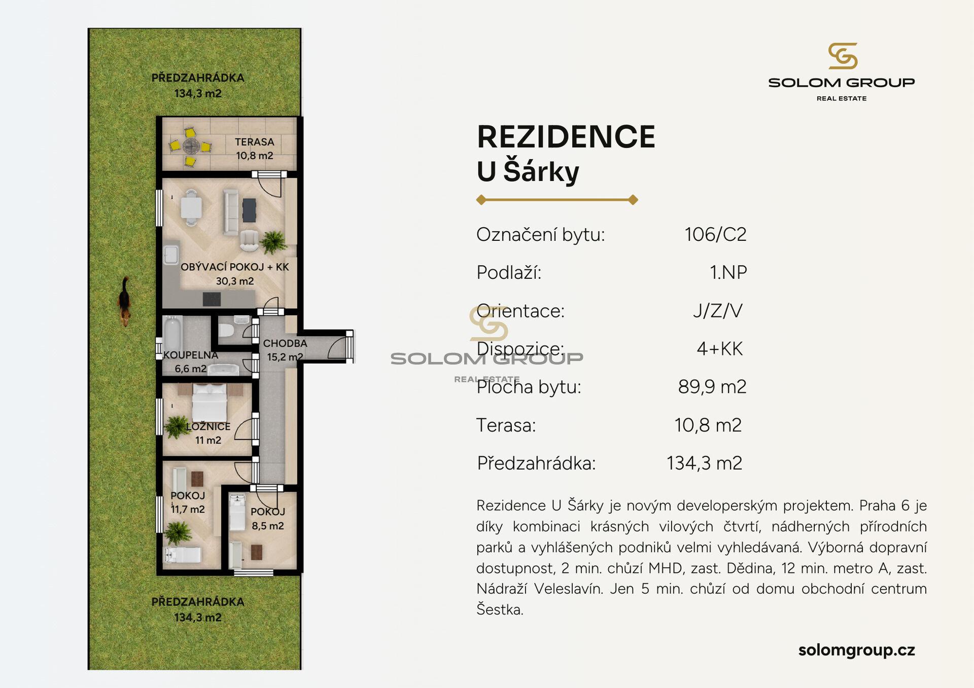 Prodej nového bytu 4+kk o velikosti 89,8 m² + předzahrádka 134,3 m², terasa 10,8 m², sklep 4 m² , který se nachází v 1. NP cihlové novostavby v rezidenci U Šárky, Praha 6 – Ruzyně (dům C2). Jelikož se jedná o družstevní byt, neprokazujete výši příjmu, nepotřebujete hypoteční úvěr a cenu bytu splácíte formou splátek v měsíčních poplatcích („měsíční splátka anuity“). Byt Vám je předán hotový vč. zařízené kuchyňské linky vybavené spotřebiči (indukce, lednice s mrazákem, el. trouba, myčka nádobí, digestoř), včetně koupelny (umyvadlo, vana, WC, topný žebřík), samostatné WC s umyvadlem, dále interiérové dveře, plastová okna, vinylová podlaha a dlažba, nové rozvody vody, elektřiny a odpadů, protipožární vchodové dveře. Byt je zcela nový, nebydlený. Akontace za byt: 7.990.000 Kč Anuita k bytu: 7.250.679 Kč Akontace za garážové stání: 190.000 Kč Anuita garážové stání: 360.000 Kč Akontace za sklepní kóji: 70.000 Kč Anuita ke sklepní kóji: 131.550 Kč Možnost vložení mimořádné splátky či doplacení celé výše anuity a převedení bytu do osobního vlastnictví. Výborná dopravní dostupnost, 2 min. chůzí MHD, zast. Dědina, 12 min. metro A, zast. Nádraží Veleslavín. V blízkosti domu se nachází Obchodní centrum Šestka, Obora Hvězda nebo Divoká Šárka. Lokalita je vhodná jak k vlastnímu bydlení, tak za účelem pronajímání. K bytu přísluší garážové stání a sklep.