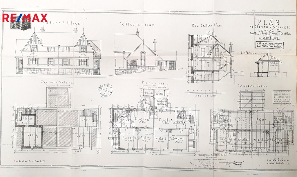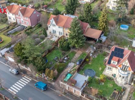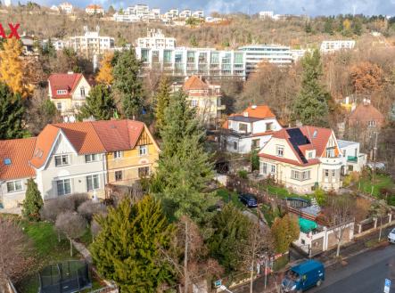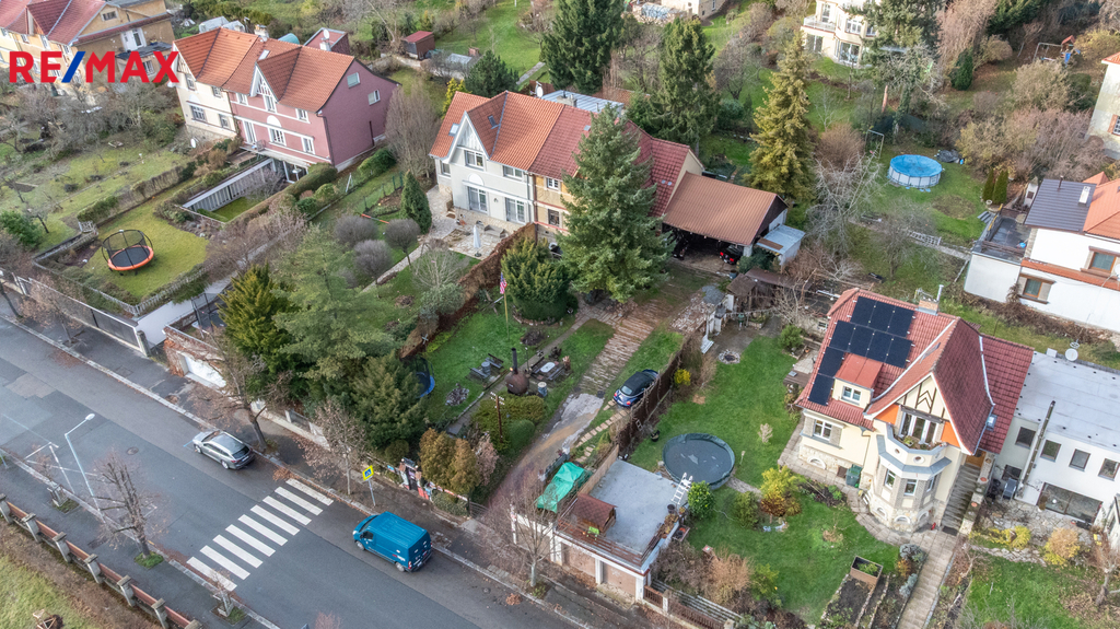Nabízíme polovinu historického dvojdomu postaveného před sto lety podle projektu žáků Jana Kotěry, architektů Jindřicha Freiwalda a Jaroslava Böhma. Krajní dům řady dvojdomů s velkou zahradou se nachází uprostřed jedinečného jižního smíchovském svahu bývalých vinic mezi Strahovem a Klamovkou. V udržovaném domě s původními dispozicemi jsou dva byty 3+1 v přízemí a v podkroví, v původně sklepních místnostech je známý Jeep Bar elegantně propojený s venkovním posezením. Přístavbou lehkého přístřešku pak vznikl prostor pro parkování strojů a vozidel. Nechybí garáž přístupná přímo z ulice. Dům je napojen na všechny v místě obvyklé inženýrské sítě. V blízkosti je veškerá důležitá infrastruktura: jesle, školka, škola, vyhlášené parky Klamovka, Ladronka, Kinského zahrada. Tramvají nebo autobusem jste za patnáct minut na smíchovském Andělu, klidnou procházkou lze pak do třičtvrtě hodiny dojít na Petřín, Pražských Hrad nebo i na Kampu na Malé Straně.