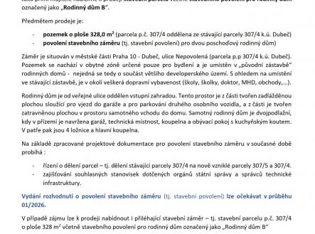 Nabízíme k prodeji STAVEBNÍ POZEMEK včetně STAVEBNÍHO POVOLENÍ ve stávající zástavbě městské části Praha 10 - Dubeč. Ideální pro ty, kteří chtějí stavět vlastní dům bez rizika zdlouhavého získávání stavebního povolení, případně pro ty hledají možnost výstavby vlastního rodinného domu. K prodeji nabízíme samostatně i druhý přiléhající pozemek (k záměru lze přistoupit i jako k investici, kdy v jedné nemovitosti lze bydlet a druhou pronajímat či prodat). Při nastavení vzájemně vyhovujících časových a finančních mechanizmů je prodejní cena k jednání. Nabízení pozemek rozloze 328 m2 představuje skvělou investiční příležitost pro bydlení s veškerým zázemím. Klíčovou výhodou je již zahrnuté STAVEBNÍ POVOLENÍÉ pro rodinný dům, což zjednodušuje a zrychluje proces plánování a výstavby. Dvoupodlažní rodinný dům je připojen na veřejné rozvody elektrické energie, vodovodu a kanalizace. Vytápění je zajištěno tepelným čerpadlem a podlahovým vytápěním. Výměna vzduchu je zajištěno rekuperační jednotkou vzduchu. Pozemek je situačně velmi příhodně umístěn s dobrou dostupností městské hromadné dopravy, autobusových linek i přilehlé silniční komunikace, což činí cestování a spojení s centrem Prahy velmi pohodlným. V přiléhající komunikaci jsou vedeny rozvody elektřiny, kanalizace, vodovodu, plynu a datové rozvody. Lokalita poskytuje klid a pohodu, kdy pozemek je umístěn v proluce stávající zástavby (nejedná se o "satelitní bydlení"), přičemž zachovává blízkost městské civilizace a všech důležitých služeb. Pokud hledáte pozemek s možností zahájení stavby na jaře příštího roku, tato nabídka je pro vás ideální volbou. Prohlídky jsou možné po předchozí domluvě. Pro více informací o této nemovitosti nebo sjednání prohlídky nás prosím kontaktujte nebo vyplňte níže uvedený formulář, rádi Vám pomůžeme. Prosím zástupce realitních kanceláří, aby nás nekontaktovali s nabídkou svých služeb. Tato nemovitost je určena výhradně přímým zájemcům o koupi. Na inzerát můžete také reagovat přímo na webu Bezrealitky: https://www.bezrealitky.cz/nemovitosti-byty-domy/954674-nabidka-prodej-pozemku-nepovolena-hlavni-mesto-praha