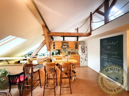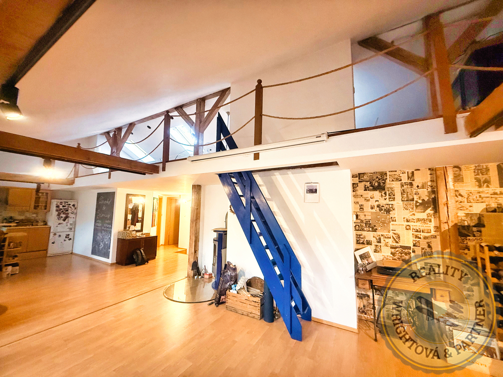Prodej prostorného bytu s duší: podkrovní mezonet s galerií a krbem – Praha 5