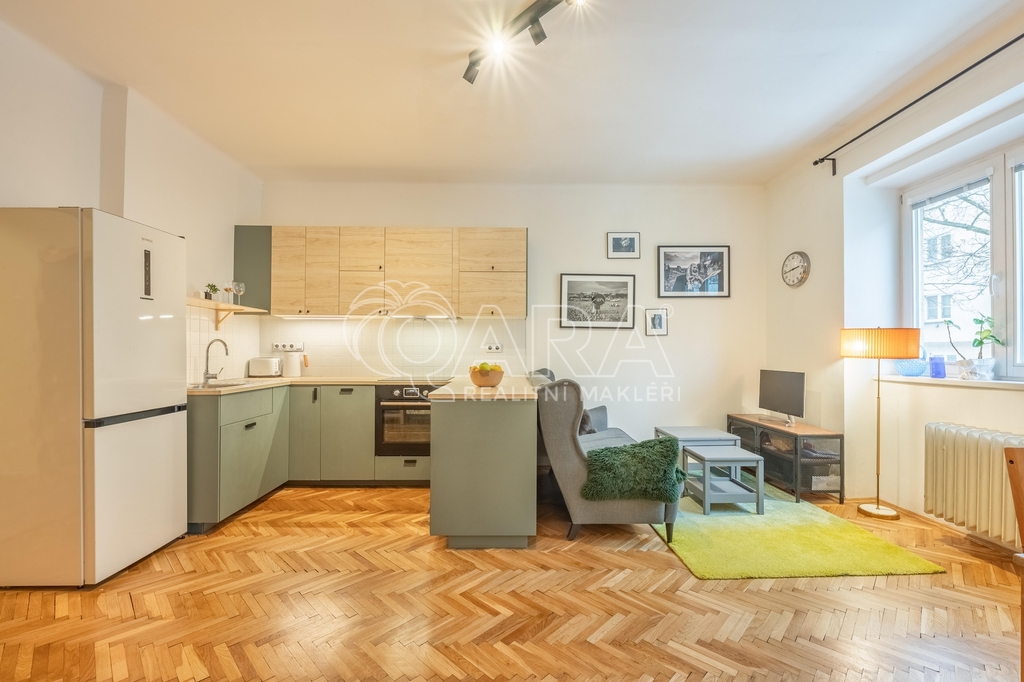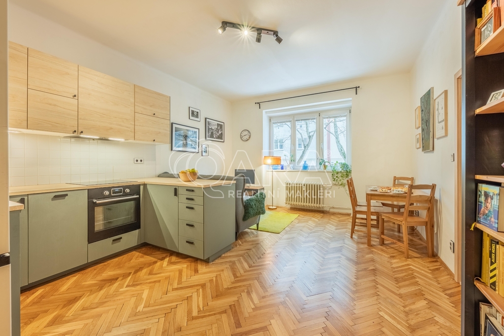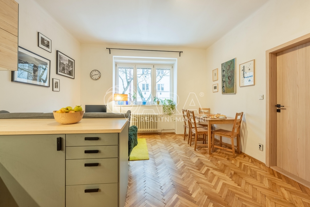 Nabízíme ke koupi velmi hezky udržovaný byt, umístěný ve zvýšeném přízemí, o dispozici 3+kk, a celkové ploše 72,9 m², který je díky svému uspořádání ideální volbou pro rodinu s dětmi i pro ty, kteří hledají komfortní bydlení bez nutnosti okamžitých investic. Byt prošel téměř kompletní rekonstrukcí – nové jsou zde elektroinstalace, broušené parkety, nová podlaha v chodbě, povrchy zdí jsou kompletně přeštukované (vyjma dětského pokoje). Kuchyňská linka je přibližně 5 let stará a je součástí prostorného obývacího pokoje. Koupelna prošla renovací před 20 lety, WC je v původním, ale plně funkčním stavu. Dispozice bytu nabízí dva neprůchozí pokoje a jeden průchozí - obývací pokoj s kuchyní, což vytváří příjemný otevřený prostor pro trávení společných chvil. V předsíni se nachází praktické úložné prostory, které výrazně zvyšují komfort bydlení. Celkově působí byt velmi světlým, vzdušným a útulným dojmem. Vytápění i ohřev vody jsou centrální, jednotka je v rámci bytového domu napojena na veřejný vodovod a kanalizaci. K bytu náleží sklepní kóje v suterénu domu. Občanská vybavenost v okolí: - mateřská a základní škola - dětská hřiště - obchody a supermarkety - lékárna, lékař - restaurace a kavárny - zastávky MHD s dobrou dostupností do centra - zeleň a místa pro volnočasové aktivity např. kino Aero, koupaliště Pražačka atp. Velkou vzácností jsou společně prostory domu. Dvorek, kde si každé odpoledne bezpečně hrajou děti až do večerních hodin, místo, kde se schází místní komunita. Dále pak sušárna a kolárna v suterénu domu. Pro více informací a sjednání prohlídky mě neváhejte kontaktovat. Těším se na viděnou!