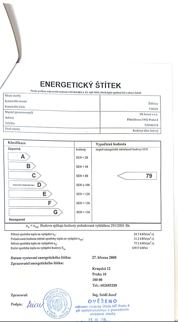 Exkluzivně nabízíme udržovaný řadový rodinný dům 5+kk ve Starých Ďáblicích (Praha 8) s užitnou plochou 300 m², ideální pro větší rodinu i vícegenerační bydlení nebo investici. Dům má tři nadzemní a jedno podzemní podlaží, prostornou terasu a krásnou zahradou se vzrostlými stromy včetně ovocných (meruňka, třešeň, švestka), která poskytuje dostatek soukromí i prostoru pro dětské hry, relaxaci nebo zahradničení. V podzemním podlaží najdete dvougaráž, komoru a velkou chodbu s úložným prostorem a východem do zahrady. V prvním patře pak zádveří, WC a velký obývací prostor, propojený s prostornou, světlou kuchyní. Z obývací místnosti vás dvojité balkonové dveře zavedou na terasu a přes ni do zahrady. Ve druhém patře se nachází dva velké světlé pokoje, spojené chodbou s koupelnou s vanou a WC, dále samostatným WC a komorou. Ve třetím podkrovním patře najdete opět dva velké a světlé pokoje, spojené chodbou a koupelnou se sprchovým koutem a toaletou. Propojení kuchyně s obývacím pokojem nabízí 55 m² otevřeného prostoru s velkým množstvím denního světla – vysoké stropy a velká okna vytváří vzdušný dojem, který nebývá v řadových domech obvyklý. V domě jsou dvě koupelny a každé patro má min. 1 WC, což je komfortní i pro větší rodinu nebo zástupce více generací. Všechna okna jsou opatřena žaluziemi. V celém domě naleznete kvalitní dřevěné masivní podlahy, dveře a zárubně i dřevěná střešní okna Velux a nadčasový design. V domě jsou nezvykle velké a dobře rozmístěné úložné prostory. Vjezd do prostorné dvougaráže zajišťují rolovací vrata – i po zaparkování dvou aut zde bez potíží umístíte další motocykl nebo kolo. Dům je kompletně napojen na sítě, vytápění a ohřev vody zajišťuje úsporný plynový kotel nebo průtokový ohřívač a je opatřen energetickým štítkem kat. C - úsporný. Nachází se v klidné rezidenční části Prahy 8, pár minut chůze od luk i polí pro vycházky s dětmi, kočárkem či se psy. Přitom jste pár set metrů od sjezdu na D8 – do centra, ale i směrem na Neratovice/Mělník/Teplice se díky tomu dostanete velmi rychle v jakoukoli denní dobu, přesto zde ruch dálnice není slyšet. Lokalita nabízí kompletní občanskou vybavenost (škola, školka, obchody, lékař, restaurace) a MHD zajišťuje velmi časté a rychlé spojení na stanici metra C- Ládví (cca 10 minut). V OC Letňany s multikinem, Aquacentrem a dalším vyžitím jste autem za 5min. Hledáte-li ideální domov pro větší rodinu, pohodlí, nadčasové provedení a klid v zeleni, s vynikající dostupností do Prahy i severních Čech jak autem tak i hromadnou dopravou, tento dům vám nabídne vše. Od kolaudace v roce 2011 v něm bydlela jen jedna rodina a teď je již několik let nevyužívaný, ale pravidelně a často navštěvovaný, udržovaný, vytápěný a větraný. Je i skvělou investiční příležitostí s možností pronájmu nebo může být reprezentativním sídlem firmy. Rádi vám pomůžeme i se zajištěním financování. Neváhejte se ozvat – domluvte si prohlídku a přesvědčte se o výjimečnosti této nabídky osobně!