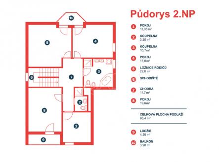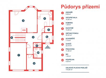 Nabídka prodeje velkoryse řešeného rodinného domu v městské části Praha 10 - Uhříněves. Dům o dvou podlažích (přízemí – 118,04 m2, patro – 104,6 m2) se rozkládá na rovinatém pozemku o celkové výměře 1 021 m2 a to v rezidenční čtvrti na Blokandě. Dům z roku 2004 je dispozičně řešen jako 6+1 s garáží a je ve velmi dobrém stavu. Přízemí využíváno jako společenská zóna: obývací pokoj s krbem a navazující terasou, samostatná kuchyně s komorou, pracovna, hala se schodištěm, koupelna se sprchovým koutem a samostatné WC. V patře se nachází čistě soukromá část, kterou tvoří 4x ložnice (tři ložnice mají vstup na balkon), hlavní koupelna s vanou, sprchovým koutem a s WC, chodba a menší koupelna se sprchovým koutem a s WC. Posledním prostorem v domě je půda (úložný prostor pro lyže, kufry, sportovní vybavení a sezonní potřeby pro celou rodinu). Dům je připojen na všechny IS (voda, kanalizace, elektřina, plyn). Vytápění domu a ohřev teplé vody zajišťuje plynový kotel umístěný v koupelně v 1.NP. Součástí domu je garáž pro jeden osobní automobil, na kterou navazuje zastřešené parkovací stání pro další osobní automobil. Zahrada je zatravněná se vzrostlými okrasnými keři a dřevinami. Nachází se na ní ohniště a zahradní domek nabízející kryté venkovní posezení. Dále je na zahradě vybudovaný zavlažovací systém. Strategická poloha v rámci Uhříněvsi – vlaková zastávka (20 minut na Hlavní nádraží) a centrum městské části (pošta, kavárna, bankomat, supermarket, restaurace, úřad MČ), ZŠ i MŠ jsou v pěším dosahu. Nejbližší zastávka BUS MHD je cca 300 m od domu. Dopravní obslužnost pak doplňuje i dobrá dostupnost na dálnici D1 a tím i na Pražský okruh. Doporučujeme zájemcům o bydlení v prostorném rodinném domě v blízkosti přírody, avšak ve stínu metropole.
