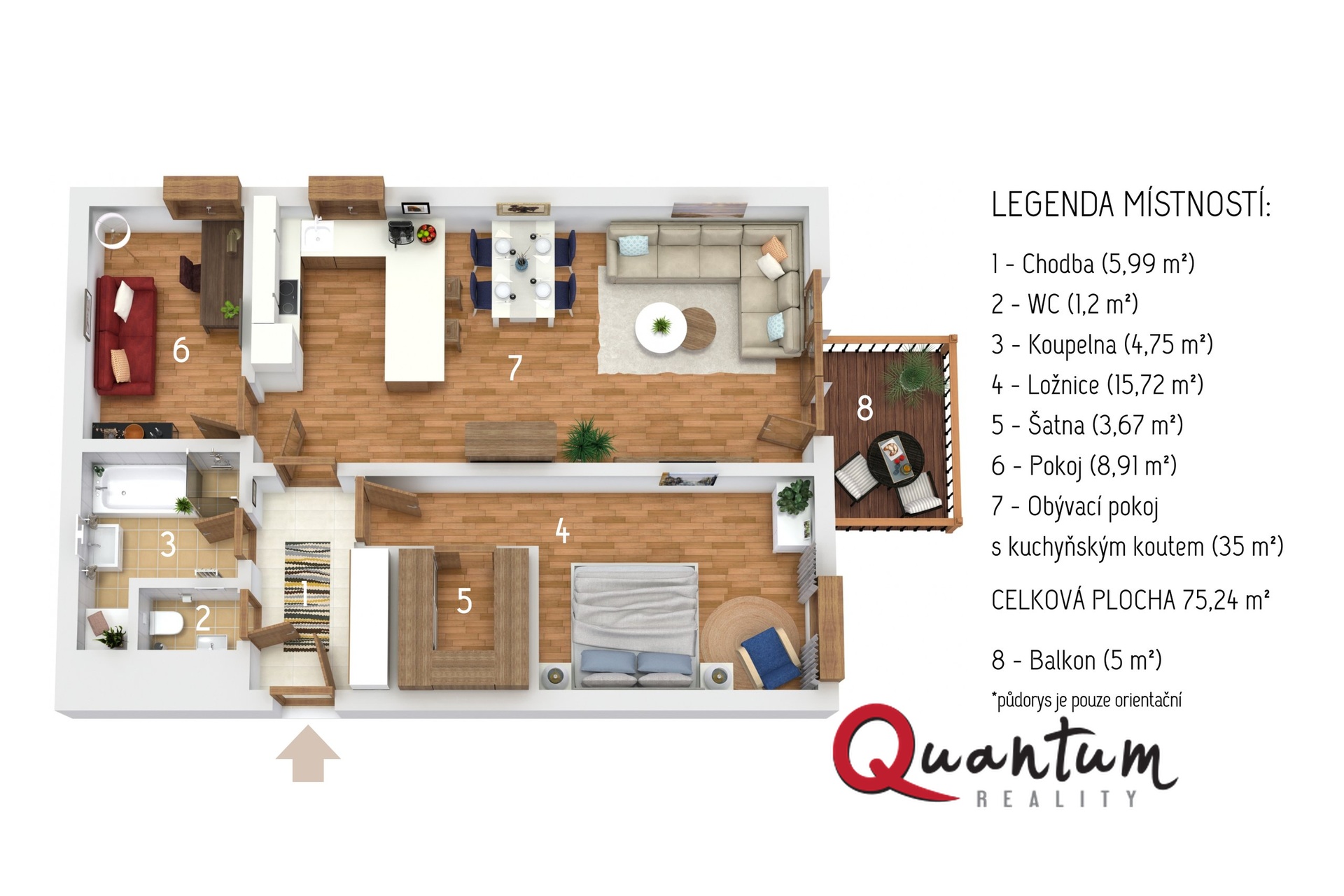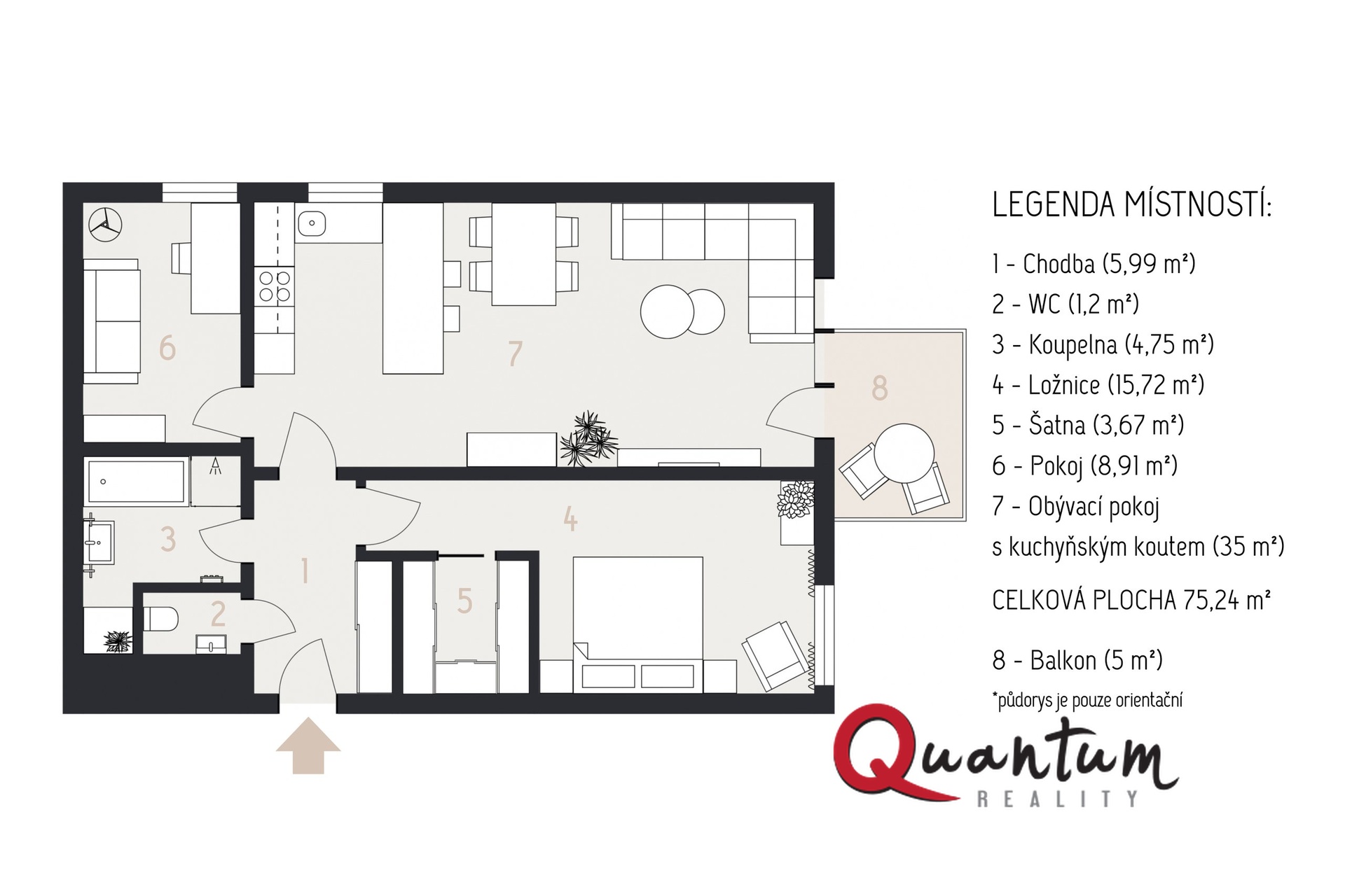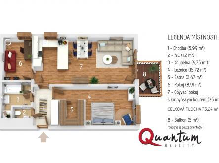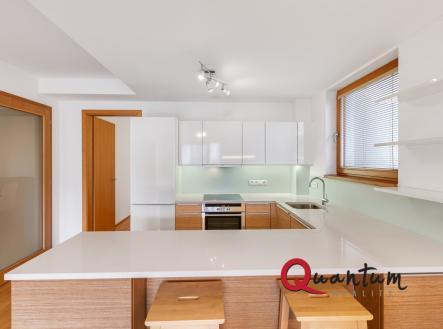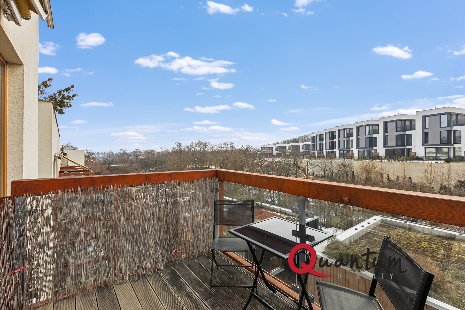 K prodeji nabízíme prostorný, útulný a moderní byt o dispozici 3+kk s balkónem, situovaný v klidné lokalitě plné zeleně, ideální pro pohodové bydlení bez městského chaosu, ale s dobrou dostupností. Byt má celkovou plochu 75 m² + balkón 5 m2 a nachází se v novostavbě domu z roku 2008. Vchod do bytu je v úrovni přízemí domu, ale díky svažitému terénu jsou okna bytu ve výšce cca druhého patra, což zajišťuje dostatek světla i soukromí. Dispozice bytu: obývací pokoj s kuchyňským koutem: 35 m², ložnice: 15,72 m², ložnice: 8,91 m², chodba: 5,99 m², koupelna: 4,75 m², samostatné WC: 1,2 m², prostorná šatna: 3,67 m². Interiér je řešen s důrazem na komfort a praktičnost. V obytných místnostech jsou kvalitní dubové parkety, které dodávají bytu teplo a eleganci. Kuchyňská linka je vybavena vestavěnými spotřebiči a kvalitní kamennou pracovní deskou a plynule navazuje na obývací část se vstupem na balkón. Balkón je vybaven výsuvnou markýzou, která zajišťuje příjemné posezení i v horkých letních dnech. V koupelně najdete sprchový kout i vanu. Velkým benefitem je samostatná, opravdu prostorná šatna v ložnici a vestavěné skříně na chodbě, takže úložného prostoru je tu víc než dost. Součástí nabídky je garážové stání a prostorný sklep. Byt se nachází v klidné a příjemné lokalitě, v docházkové vzdálenosti na zastávku autobusu, s rychlou dostupností do města a zároveň blízko přírody – ideální kombinace.