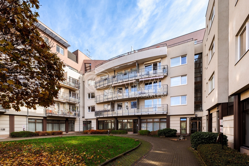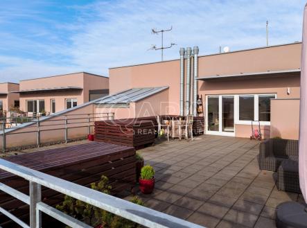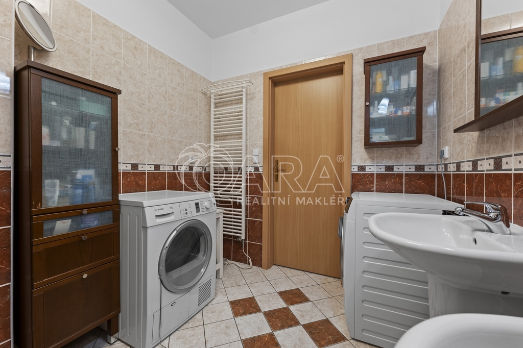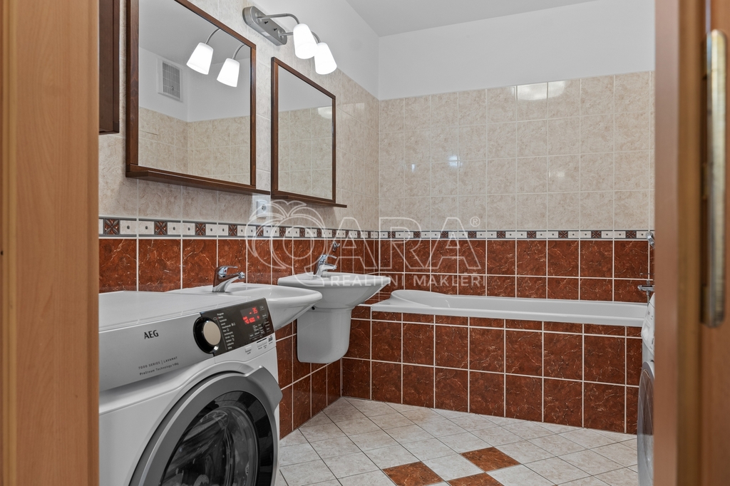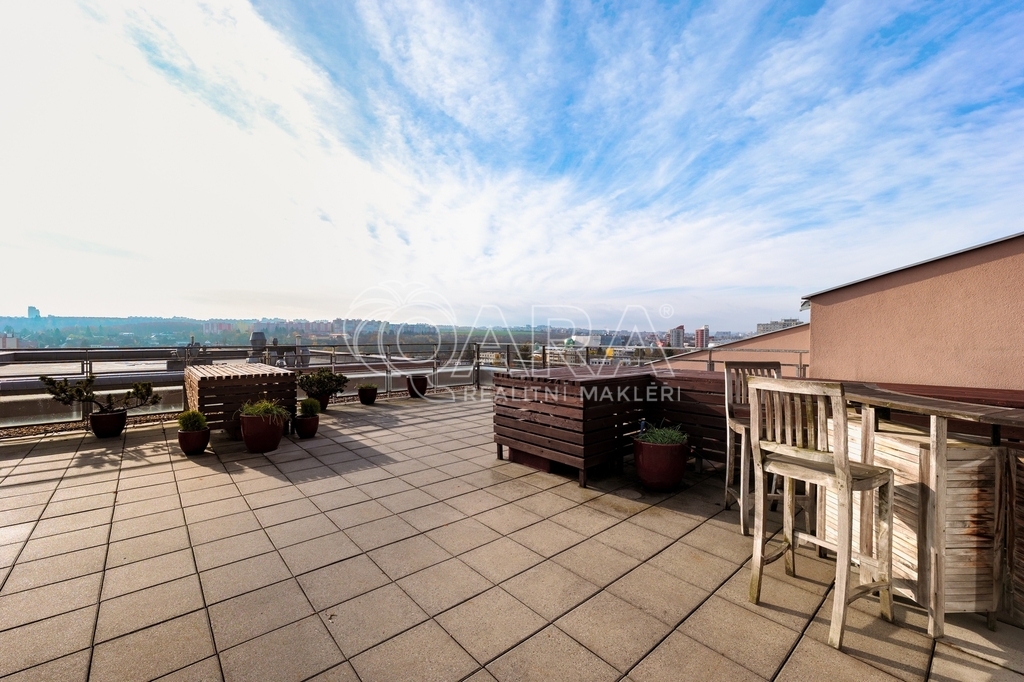 Nabízíme vám pronájem plně vybaveného, prostorného bytu s krásným výhledem a obrovskou terasou o dispozici 3+kk ve velmi žádané lokalitě v ulici Pražská, Praha 15 – Hostivař. Nadstandardní byt disponuje podlahovou plochou 91 m² + terasou o rozloze 100 m², sklepem a dvěma garážovými stáními. Byt se nachází v posledním 6. patře domu s výtahem. Na patře je pouze tento byt, což zaručuje naprosté soukromí. Dům je pečlivě udržovaný. Součástí vybavení je na míru zhotovená kuchyňská linka s vestavěnými spotřebiči (varná deska, elektrická trouba, myčka, lednice a mrazák). Dále budete mít k dispozici mikrovlnnou troubu a jídelní stůl se čtyřmi židlemi značky TON. V obývací části se nachází pohovka, konferenční stolek a televize. V ložnici je manželská postel, televize, skříně, psací stůl a židle. Dětský pokoj je vybaven postelí, skříněmi, psacím stolem a židlí. V ložnici i dětském pokoji jsou další samostatné balkony. V prostorné koupelně je vana, dvě umyvadla, pračka a sušička. WC je samostatné. V bytě se dále nachází komora. Podlahy v bytě jsou plovoucí, v koupelně a na WC je dlažba. Dostatek úložného prostoru zajišťují vestavěné skříně na chodbě. Ve všech pokojích je instalována klimatizace. Vchodové dveře jsou bezpečnostní a byt může být střežen systémem Jablotron. Terasa je vybavena velkou ratanovou sedačkou, slunečníkem, barem se židlemi a okrasnými keři. Terasa bytu je orientována na jih, pokoje mají okna na východ. V podzemním patře domu můžete využívat dvě vedle sebe stojící garážová stání a sklep o velikosti 3 m². Byt dosud nebyl nikdy pronajímán. Okolí domu je klidné, s veškerou občanskou vybaveností. Minutu chůze od domu je zastávka autobusu Záveská, odkud se dostanete za 7 minut na metro Skalka. Při použití MHD můžete být například na Václavském náměstí za 19 minut. Na procházky je ideální vyhledávaný Přírodní park Hostivař. V okolí jsou restaurace, obchody, školy, lékárny a mnoho dalšího. Cena nájmu: 40 000 Kč + 5 310 Kč poplatky (1os.) + přepis elektroměru 2 000 Kč. Pokud hledáte opravdu prostorný byt a vyhovuje vám bydlet v žádané lokalitě se skvělou dostupností do centra a veškerou občanskou vybaveností, zavolejte mi nebo napište – byt vám osobně ukážu.