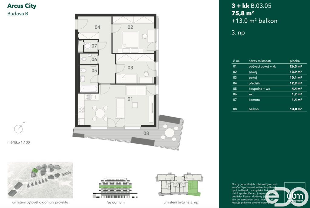 Nabízíme Vám k dlouhodobému pronájmu exkluzivní byt 3+kk 93,1 m² s balkonem a garážovým parkovacím stáním v ulici Hasilova v novém projektu Arcus City na Praze 13. Bytová jednotka o celkové užitné ploše 93,1 m² se nachází ve 3. podlaží skeletové řadové novostavby a byla obydlená pouze přibližně 2 roky. Užitná plocha bytu, tedy plocha obytných místností uvnitř vnějších stěn nemovitosti, je 76,4 m². Skládá se z chodby s vestavěnou skříní na míru, dvou pokojů, obývacího prostoru s kuchyní na míru (německé high-quality značky Nobilia), koupelny s vanou, WC a umyvadlem, dalšího samostatného WC s umyvadlem, komory a balkonu (13,5 m²), který je přístupný z obývacího pokoje. Pokoje jsou situovány na jihovýchod. Co se týče spotřebičů, tak kuchyně disponuje indukční varnou deskou s digestoří, vestavěnou myčkou, mikrovlnnou troubou, elektrickou troubou a lednicí s mrazákem. Vše značky Siemens. K bytové jednotce dále náleží zděný sklep (3,2 m²) a garážové parkovací stání. Je zde také možnost využívat kočárkárnu či kolárnu. Aktuální nájemce nabízí v případě zájmu odprodej části vybavení bytu. Lokalita: Projekt se nachází na pomezí městských částí Stodůlky a Řeporyje, které jsou vyhledávanými klidnými a malebnými čtvrtěmi. V bezprostředním okolí lze najít veškerou občanskou vybavenost – školky, základní a střední školy, obchody, služby, restaurace, polikliniku, poštu, sportoviště a mnoho dalších volnočasových aktivit. Atraktivnost lokality je zvýšena blízkostí jednoho z největších OC v Praze – Metropole Zličín, nebo rovněž Golf Clubu Praha. K relaxaci a sportovnímu vyžití lze využít bohatou okolní zeleň – biopark Řepora nebo Prokopské a Dalejské údolí. Doprava: Pouze pár kroků od bytového domu na náměstí Arcus City je umístěna zcela nová zastávka, ze které Vás autobus doveze za minutu k metru stanice Stodůlky či Luka. Autem je oblast také dobře dostupná. Projekt se nachází v blízkosti Pražského okruhu, do centra Prahy nebo na letiště Václava Havla se dostanete za 15 min. Jde o ideální byt jak pro jednotlivce, tak pro pár či rodinu, bez zvířat a pro nekuřáky. Je k dispozici ihned. Nájemné zde činí 33 000 Kč plus zálohové platby včetně elektřiny 7 300 Kč. Energie se nepřevádí. Celkem je tedy nájemné 40 300 Kč. Vratná kauce je ve výši jednoho nájmu bez poplatků. Provize je ve výši jednoho a půl měsíčního nájmu bez poplatků. V případě zájmu o prohlídku či více informací mne neváhejte kontaktovat. Rád Vás uvidím osobně přímo v bytě či v rámci videoprohlídky z pohodlí Vašeho domova.