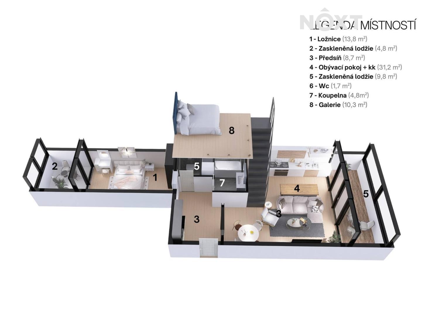 Nabízíme k pronájmu stylový loftový mezonetový byt o dispozici 2+kk s galerií a dvěma lodžiemi, nacházející se ve 3. nadzemním podlaží rezidenčního projektu Parvi Cibulka, který vznikl rekonstrukcí bývalého výrobního areálu Meopta. Projekt kolaudovaný v roce 2022 nese podpis renomovaného developera YIT, který je známý kvalitními realizacemi ve skandinávském duchu – s důrazem na nadčasový design, funkčnost a udržitelná řešení. Byt má celkovou podlahovou plochu 63,7 m² a díky otevřené dispozici působí velmi vzdušně. Dominantou prostoru je obývací pokoj s vysokými stropy, který je spojený s kuchyní vybavenou kuchyňskou linkou, sporákem, myčkou, troubou a s přímým vstupem na jednu ze dvou zasklených lodžií o výměře 9,8 m². Druhá lodžie s plochou 4,8 m² je přístupná z ložnice a obě jsou určeny k výlučnému užívání nájemcem bytu. V rámci dispozice je zde navíc galerie 10,3 m², která nabízí prostor pro pracovnu, knihovnu, odpočinkovou zónu nebo úložný prostor. Koupelna je moderně zařízená a zahrnuje vanu, umyvadlo i prostor pro pračku a sušičku. Samostatné WC přidává na komfortu každodenního bydlení. Do uvedených místností se vstupuje z předsíně vybavené velkou vestavěnou skříní, zmíněná galerie je přístupná z obývací části. K bytu náleží sklepní kóje a za příplatek 3.000 Kč měsíčně vlastní parkovací stání v suterénu budovy. Samotný dům nabízí obyvatelům i řadu praktických a komunitních benefitů, kterými jsou např. recepce s ostrahou v provozu 24 h, moderně vybavená posilovna, prostor pro umytí kol, sportovního vybavení a psů, komunitní dílna a jako netradiční bonus – zrekonstruovaný historický protiatomový kryt, který je součástí suterénu. Před domem je navíc ve vnitrobloku uzavřený prostor s dětským hřištěm a relaxační zónou v zeleni. Atraktivní lokalita nabízí výbornou dostupnost MHD i občanskou vybavenost v okolí. V docházkové vzdálenosti je přírodní park Cibulka, ideální na procházky, sport nebo odpočinek. Byt je vhodný pro jednotlivce, pár nebo menší rodinu, kteří hledají moderní bydlení v designovém prostoru s přidanou hodnotou – a ocení práci developera, který se zaměřuje na vyšší standard a kvalitní provedení. Nájemné 34.000 Kč měsíčně, kauce 68.000 Kč, provize RK 34.000 Kč. Pro komunikaci uvádějte evidenční číslo zakázky N115699.