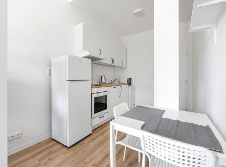K dlouhodobému podnájmu nabízíme krásný nový, kompletně vybavený byt o dispozici. 1+kk v klidné lokalitě Kyje, vybavený inteligentním přístupem do domu i bytu. Byt o celkové výměře 25m2 se nachází v 1. podlaží cihlového domu s podlahovým vytápěním. Byt se nabízí plně vybavený. Kuchyně disponuje lednicí, myčkou, elektrickou troubou, varnou deskou, mikrovlnnou troubou, rychlovarnou konvicí a digestoří. Obývací část je oddělena a zařízena rozkládací postelí, včetně matrací, lůžkovin a ložního prádla, tv stěnou, televizí, jídelním stolem a židlemi. V koupelně je sprchový kout, umyvadlo, toaleta, pračka i ručníky. Základní internetové připojení je v ceně služeb. Přímo v domě se nachází fitness centrum, kadeřnictví a nehtové studio. V okolí domu najdete restaurace, supermarket, základní a mateřskou školu, lékárnu atd. Výborná dopravní dostupnost: - Čtyři minuty chůze od domu je zastávka metra Rajská Zahrada a vlaková stanice Praha Rajská Zahrada vlakem (!! za 13 minut v centru Prahy!!) - Autobusové zastávky jsou hned vedle domu. Majitel preferuje zájemce bez domácích mazlíčků. Byt je volný k nastěhování OD 1.3. Energetická třída: B