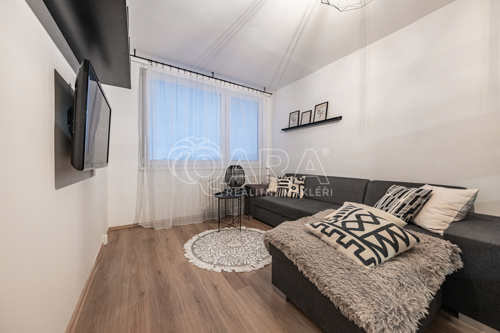 Nabízím k pronájmu pěkný nekuřácký byt po rekonstrukci v Praze Hájích dispozičně řešený jako 2+kk s užitnou plochou 43 m2. Byt se nachází v 9. patře s výtahem v pěkném, celkově revitalizovaném panelovém domě. Nově je zde vybudován bezbariérový přístup do domu. Byt prošel celkovou rekonstrukcí, zděné bytové jádro - koupelna s vanou a toaletou. Nová kuchyňská linka s plynovým sporákem a troubou, nová lednice s mrazákem. Nové plovoucí podlahy. Byt se pronajímá částečně zařízený. Z prostorné předsíně se vchází do všech místností v bytě. Koupelna je spojena s toaletou, vybavená je vanou a umyvadlem, zrcadlovou skříňkou, pračka k dispozici. Ložnice (12 m2) je vybavena postelí 160 x 200 cm a nočním stolkem. Dominantou je prostorný obývací pokoj (16 m2) propojený s útulným kuchyňským koutem. K dispozici je rozkládací sofa, TV, regály sloužící jako úložné prostory, jídelní stůl se židlemi. Kuchyňská linka je nová, disponuje velkým dřezem, novou lednicí s mrazákem, plynovým sporákem s troubou a digestoří. Pronájem činí 22.000,-- Kč měsíčně, veškeré služby včetně elektrické energie jsou 6.000,-- Kč/měsíčně. Vratná kauce pronajímateli činí 22.000,-- Kč, odměna zprostředkovatele je 22.000,-- Kč. Byt je volný ihned. V případě zájmu o termín prohlídky mne kontaktujte telefonicky.