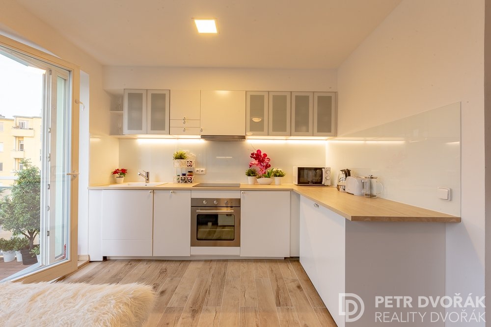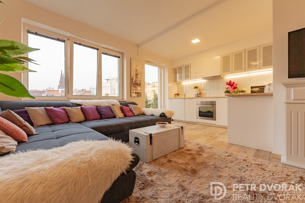 Nabízíme k pronájmu elegantní byt 3+kk s balkonem o celkové ploše 98 m², situovaný ve 7. nadzemním podlaží udržovaného činžovního domu s výtahem v prestižní lokalitě Královských Vinohrad, v ulici Uruguayská, Praha 2. Byt je k nastěhování dle domluvy, prakticky ihned. Interiér bytu tvoří prostorný obývací pokoj s plně vybavenou kuchyní, ze kterého je vstup na balkon s otevřenými výhledy na okolní zástavbu Vinohrad, včetně ikonických věží chrámu sv. Ludmily na Náměstí Míru. Dispozici dále doplňují dvě samostatné ložnice, koupelna s vanou, samostatná toaleta a vstupní hala. Byt je prakticky orientován – ložnice na jihovýchod, obytná část s kuchyní na severozápad, což zajišťuje dostatek denního světla po celý den. Nemovitost prošla kompletní rekonstrukcí v roce 2018, zahrnující nové rozvody elektřiny, vody a odpadů, nové omítky a repasované dřevěné podlahy. Byt je nabízen kompletně zařízený. Kuchyňská linka je vybavena vestavnými spotřebiči (sklokeramická varná deska, elektrická trouba, myčka, lednice, digestoř). Součástí vybavení je také pračka. Obytný prostor doplňuje sedací souprava a jídelní stůl, v ložnicích jsou manželské postele, šatní skříně budou instalovány. V bytě jsou bezpečnostní vstupní dveře, k dispozici je vysokorychlostní internet. Vytápění je zajištěno centrální domovní kotelnou. Dům je ve velmi dobrém technickém stavu. Velká okna podtrhují vzdušnost interiéru a poskytují příjemné výhledy do okolí. Lokalita Královských Vinohrad patří dlouhodobě k nejžádanějším rezidenčním adresám v Praze. Nabízí výbornou dostupnost do centra města, stanici metra A – Náměstí Míru i několik tramvajových linek v docházkové vzdálenosti. V okolí se nachází široká nabídka restaurací, kaváren, lokálních obchodů i kulturních institucí. Relaxaci v zeleni umožňují Riegrovy sady a Havlíčkovy sady. Byt je vhodný pro klienty hledající kvalitní bydlení v klidném prostředí prestižní městské čtvrti, s výbornou dostupností a vysokým standardem. Pro více informací nebo sjednání prohlídky kontaktujte realitního makléře.