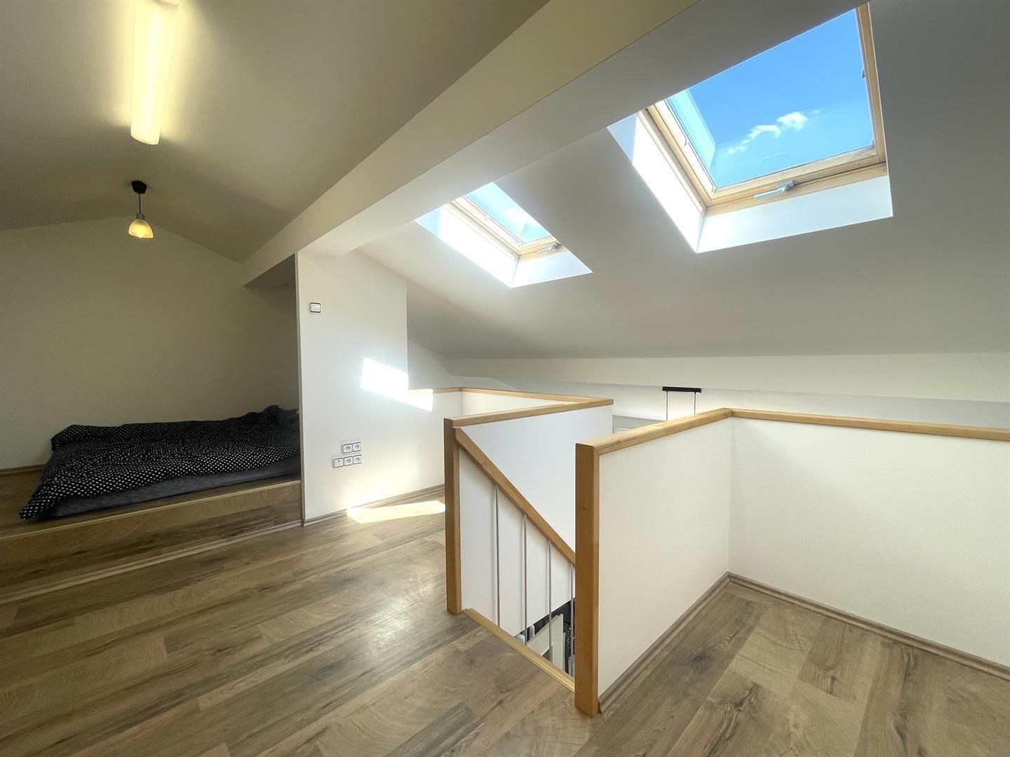 Exkluzivní pronájem světlého a zajímavě řešeného bytu 3+kk s balkonem (75 m2), v žádané lokalitě Hřebenka v Praze 5 – Smíchov. Byt je situován ve 3. patře dobře udržovaného cihlového domu (bez výtahu) v ulici Nad Palatou a z lodžie je nádherný panoramatický výhled na centrum Prahy. Byt je volný k nastěhování, nekuřácký, bez domácích mazlíčků, obsazenost do max. 3 osob / dlouhodobý pronájem. Byt je na klidném místě obklopeném zelení a v docházkové vzdálenosti jsou park Ladronka, lesopark Hvězda a Petřínské sady. Přímo za domem je pro relaxaci malý parčík. Veškerá občanská vybavenost je samozřejmostí, zastávka autobusu MHD je 150 m a spojení do centra trvá cca 15 minut. Parkování je možné na ulici před domem a v okolních ulicích (parkovací zóny pro rezidenty). V bytě se nachází obývací pokoj s plně vybaveným kuchyňským koutem (lednice, mrazák, myčka, varná deska, horkovzdušná trouba) a lodžie, ložnice, vstupní hala, koupelna s rohovou vanou, pračkou a v rámci koupelny je oddělené WC. Schodištěm z obývacího pokoje je přístupný další obytný prostor a v bytě se dále nachází dvě praktické komory. Byt je částečně vybaven, zůstávají dvě vestavné skříně a pohovka dle dohody. Ústřední vytápění a ohřev vody je na plyn (kondenzační kombi kotel), okna plastová izolační skla, interiérové dveře dřevěné, vstupní dveře bezpečností, na podlahách je vinyl – altro, keramická dlažba a laminátová plovoucí podlaha. Do bytu je zaveden internet, a dále možnost připojení UPC. Zúčtovatelná záloha (plyn+elektřina+vodné / stočné) 4.000,Kč/mesíčně na byt pololetní kalendářní vyúčtování dle skutečnosti, dále paušální poplatek na 1 osobu 739,Kč/měsíčně (komunální odpad, společná elektřina, úklid společných prostor apod.). Vratná kauční jistota je částka dvojnásobku měsíčního pronájmu. Pokud Vás nabídka zaujala, navrhněte termín prohlídky či zašlete případné dotazy prostřednictvím kontaktního formuláře.