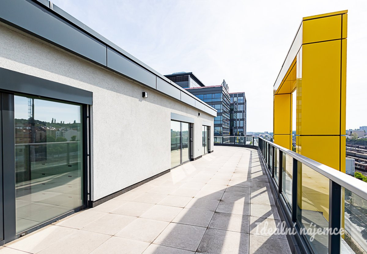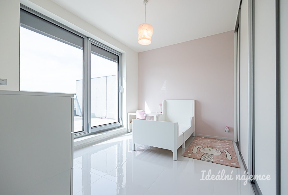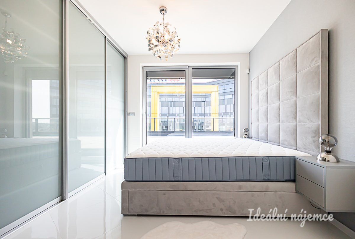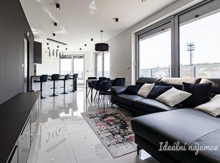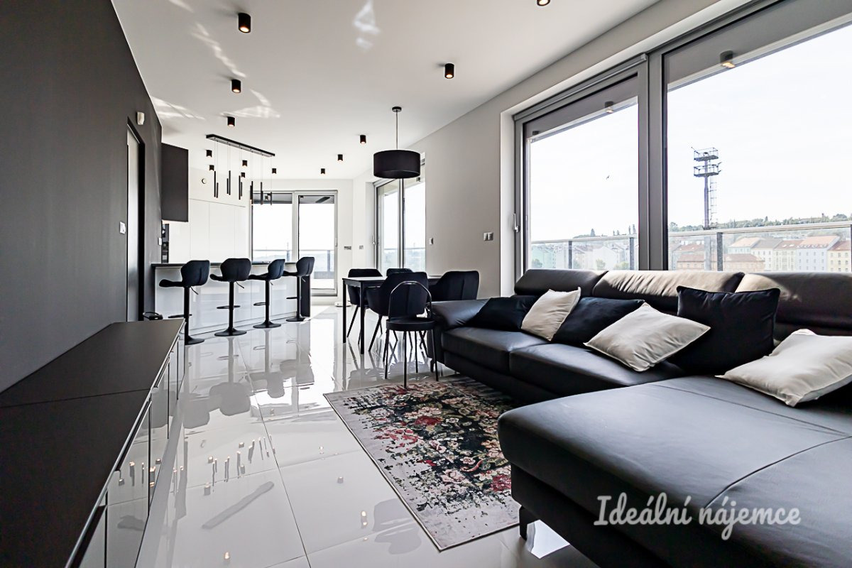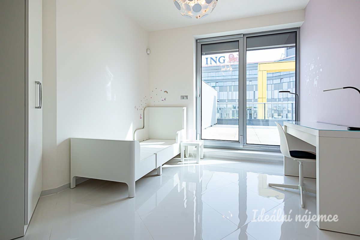 K dlouhodobému podnájmu nabízíme exkluzivní rezidenční byt 4+kk s kompletním zařízením, situovaný ve vyhledávané lokalitě Praha 9 – Libeň. Tento luxusní byt o celkové výměře 107 m² se nachází ve 13. patře moderní rezidence Harfa Design Residence. Velkým benefitem je prostorná terasa, která obklopuje značnou část bytu, a k dispozici je rovněž garážové stání. Byt je nabízen plně vybavený a připravený k okamžitému nastěhování. Kuchyně disponuje barovým posezením, lednicí s mrazákem, elektrickou i mikrovlnnou troubou, indukční varnou deskou, digestoří a myčkou. Na kuchyň plynule navazuje obývací pokoj s pohodlnou sedací soupravou, konferenčním stolkem, TV setem a jídelním koutem. V bytě jsou dále dva samostatné pokoje vybavené postelí, vestavěnou skříní a pracovním stolkem se židlí. Dominantou hlavní ložnice je luxusní manželská postel s čelem doplněná o vestavěnou skříň. Hlavní koupelna je zařízena vanou, umyvadlem, koupelnovou skříňkou a sušičkou, zatímco koupelna u ložnice nabízí sprchový kout a umyvadlo. Toaleta je samostatná. V okolí domu je k dispozici kompletní občanská vybavenost – nákupní centrum Galerie Harfa, restaurace, kavárny, poliklinika, pošta, školky a školy. Pro volný čas je ideální nedaleký Park Podviní, kam lze dojít během několika minut chůze. Lokalita se vyznačuje také výbornou dopravní dostupností, a to díky blízkým tramvajovým zastávkám i stanici metra Českomoravská (linka B). Byt je volný k nastěhování od 1.2.2026. Energetická třída: G (průkaz nedodán).