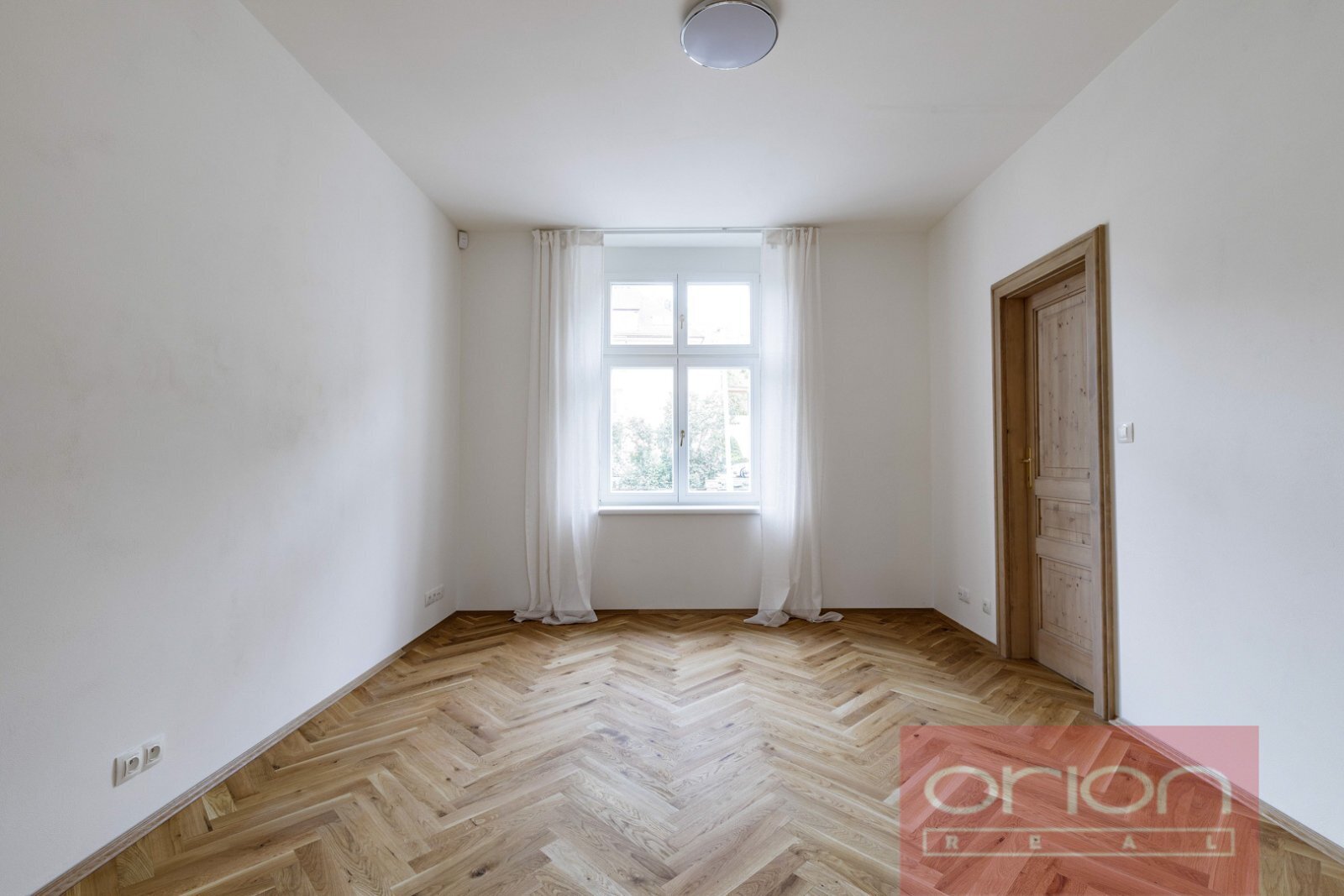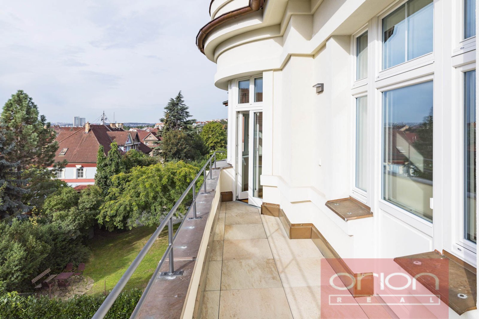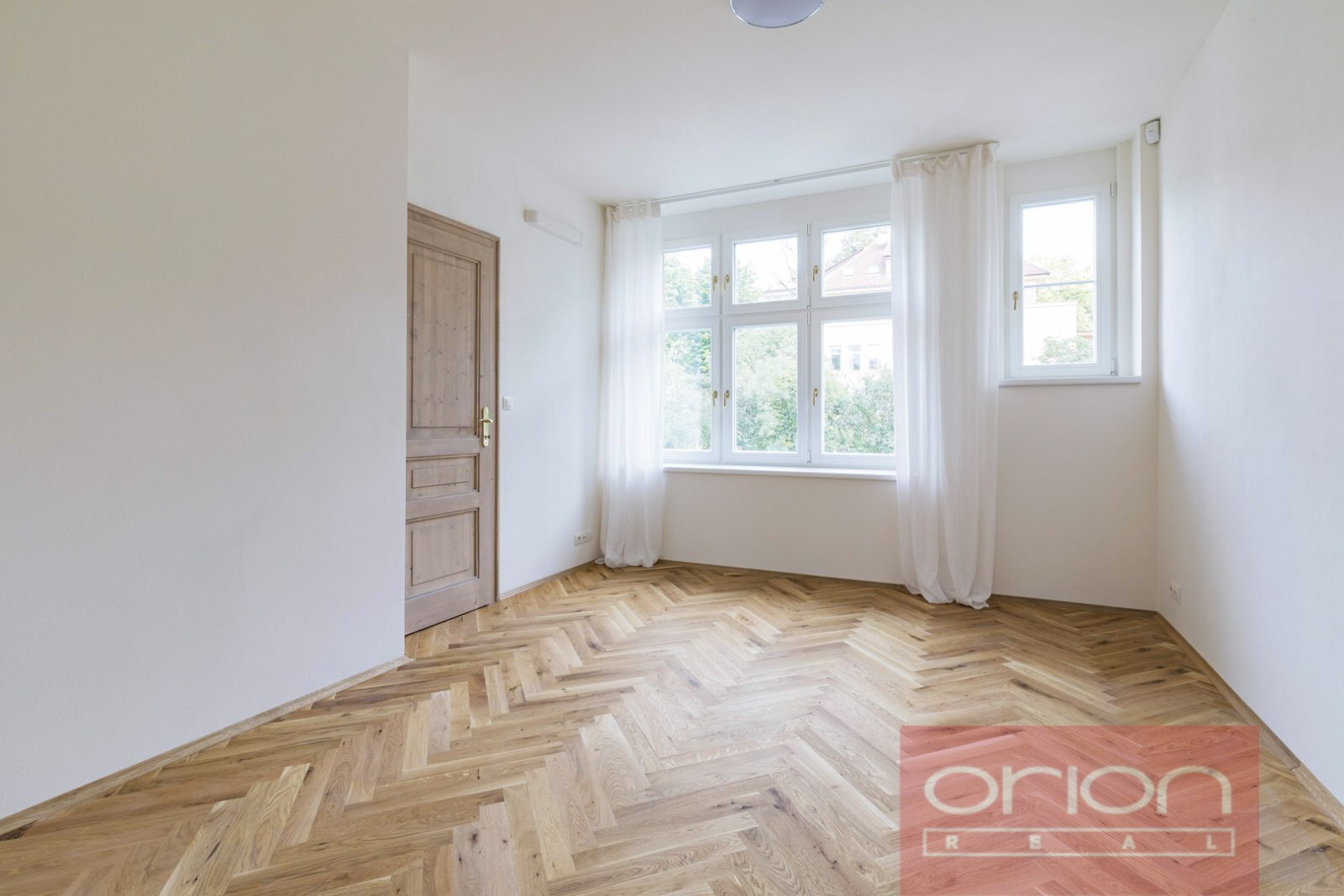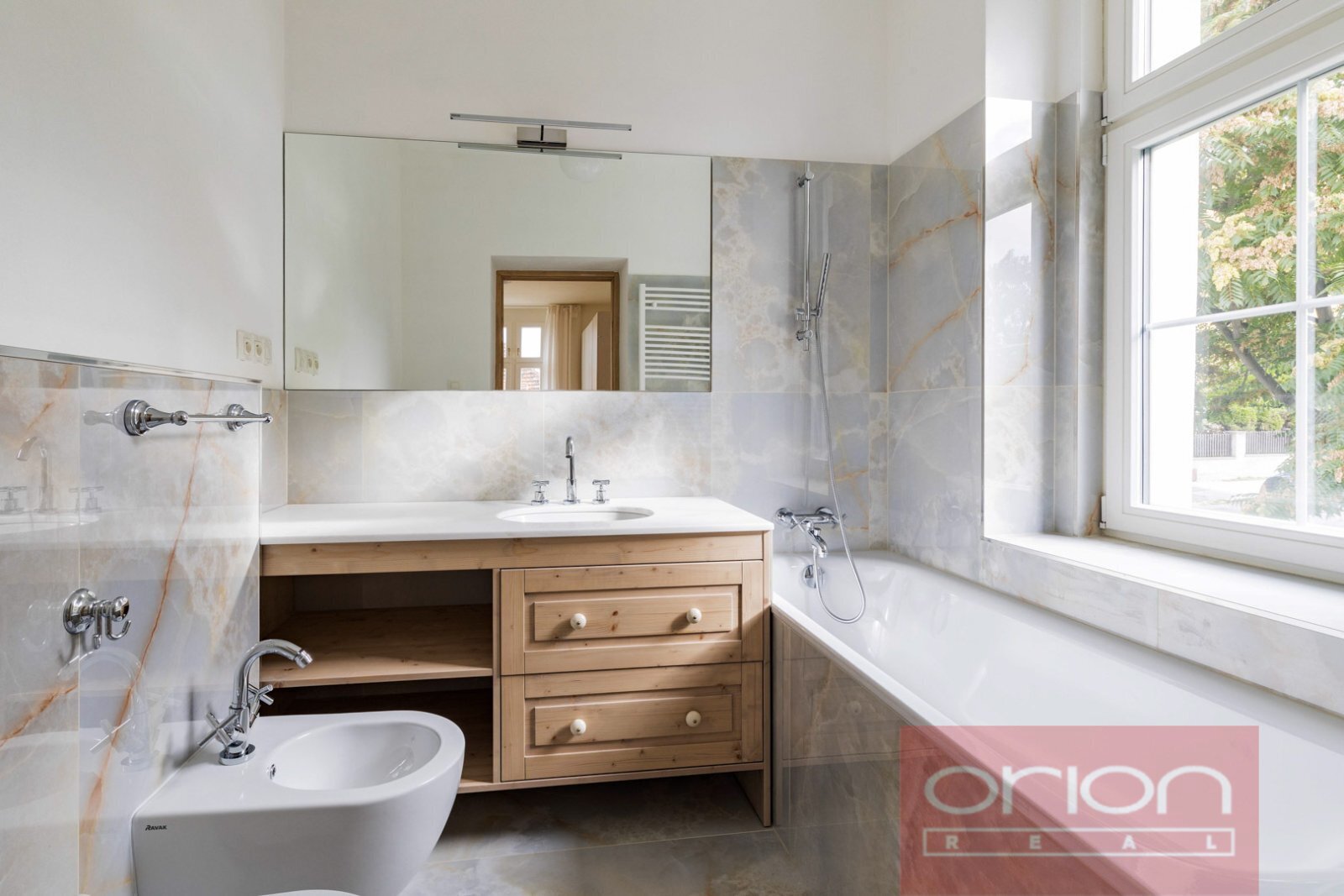 Nabízíme k pronájmu kompletně zrekonstruovaný, klimatizovaný byt v 1. patře rodinné vily se zahradou ve vyhledávané lokalitě Praha 10 - Vinohrady. Luxusní zařízený byt 4+1 má plochu 120 m2 a nabízí vstupní halu, plně vybavenou moderní kuchyň s jídelním koutem, prostorný a světlý obývací pokoj s velkými okny, s arkýřem a se vstupem na jižně orientovanou terasu o velikosti 10 m2, 3 ložnice, 3 koupelny (vana, sprchový kout, bidet, umyvadlo)), komoru. K vybavení bytu patří dřevěné parkety a mramorová dlažba s podlahovým vytápěním, pračka se sušičkou, klimatizace, alarm a samostatný plynový kotel. Dům se nachází v klidné vilové čtvrti, pouze pár kroků od tramvajové zastávky, 15 minut chůze ke stanici metra a nákupnímu centru Flora. Lokalita s velice dobrou dopravní dostupností MHD i autem, s veškerou občanskou vybaveností. V blízkém okolí množství obhodů, restaurací, bister, kaváren, nedaleko parků a městské zeleně. Preferovaná platba nájmu v EUR .