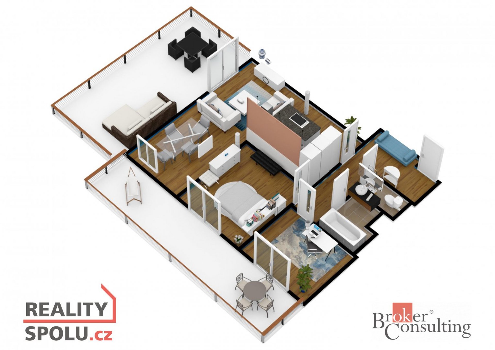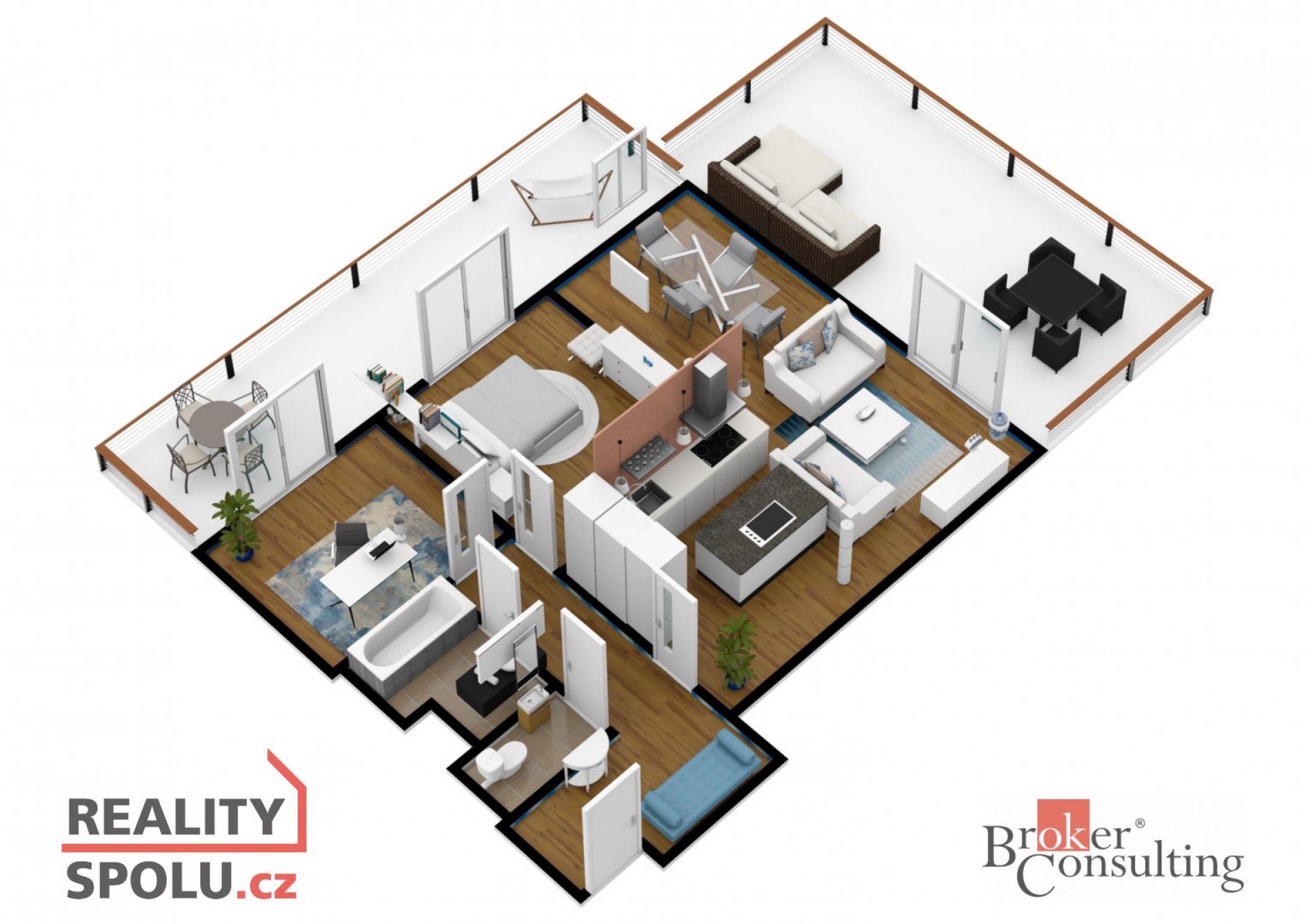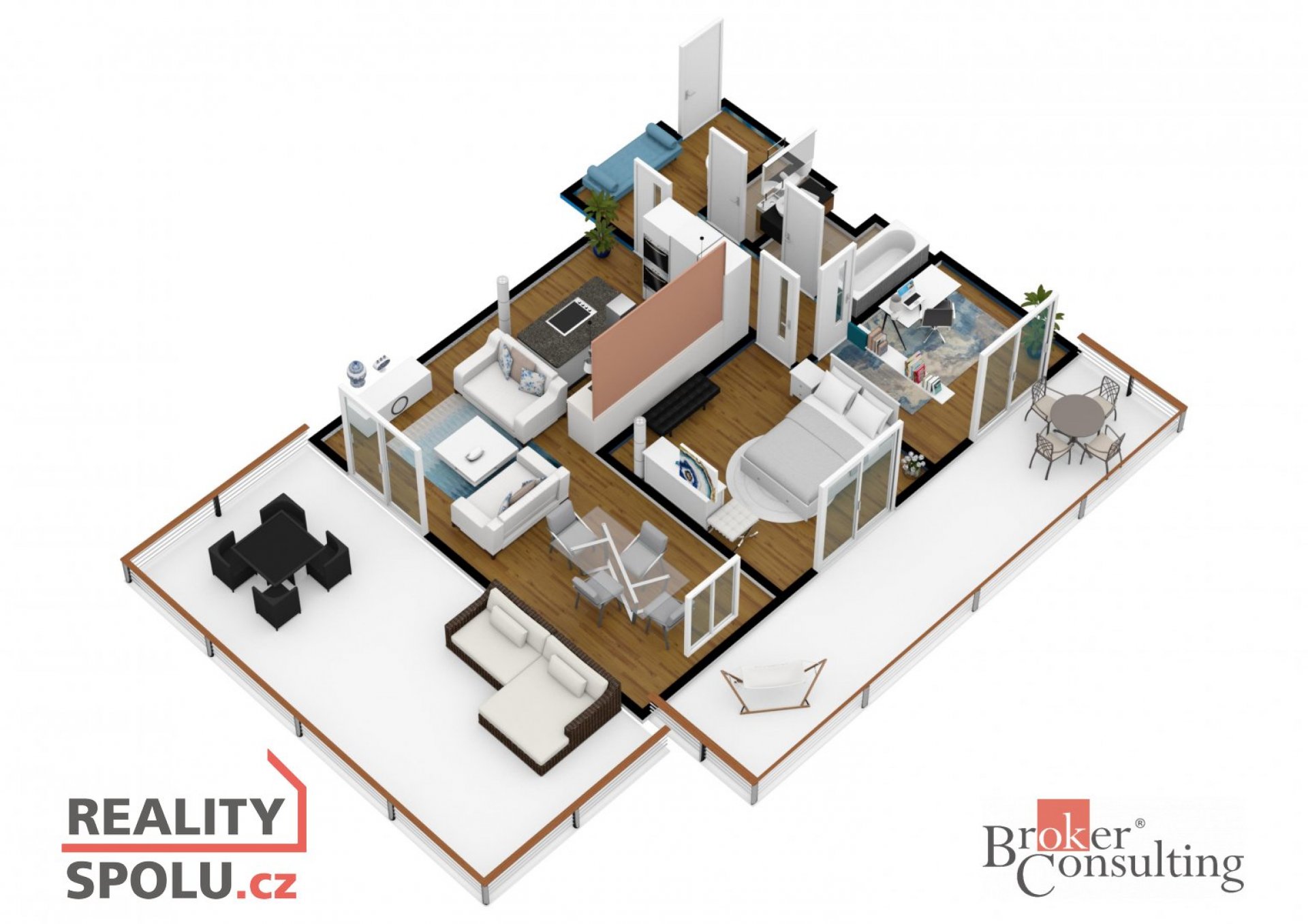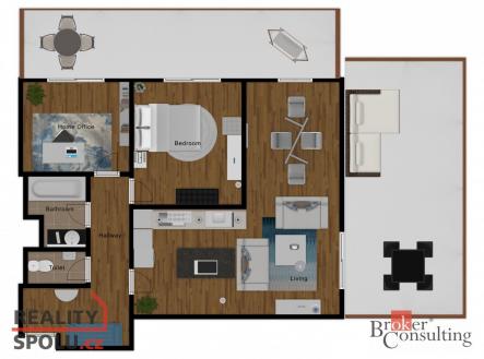 Nabízím k pronájmu kompletně zařízený moderní vzdušný byt 3+kk s ohromnou terasou, balkonem, garážovým stáním a prostorným sklepem. Byt se nachází v předposledním podlaží třípatrového domu s výtahem v moderním komplexu Šafránka v lokalitě Praha - Řeporyje. Plocha bytu je 76 m2, terasa má 35m2, balkon 12m2. Současné dispoziční uspořádání bytu nabízí obývací pokoj s otevřenou kuchyní, jídelnou a přístupem na velkou terasu s krásným výhledem do zeleně, hlavní ložnici s další menší terasou a druhou ložnicí, koupelnu, wc. V ceně pronájmu je parkovací stání v podzemní garáži a komora, v domě je výtah. Byt je volný k nastěhování od 15.1.2025. Preferujeme dlouhodobé zájemce. Měsíční nájem 35 000,-Kč, aktuální zúčtovatelné zálohy na služby a poplatky 4500,- Kč/měsíc. Elektřina bude převedena na nájemníka. Vratná kauce ve výši 2 měsíčních nájmů. Provize realitní kanceláři jeden měsíční nájem + DPH. Výborná dopravní dostupnost: ke stanici metra Luka 5 minut. Veškerá občanská vybavenost - školy, školky, obchody. Těším se na společnou prohlídku, velice ráda Vás provedu.