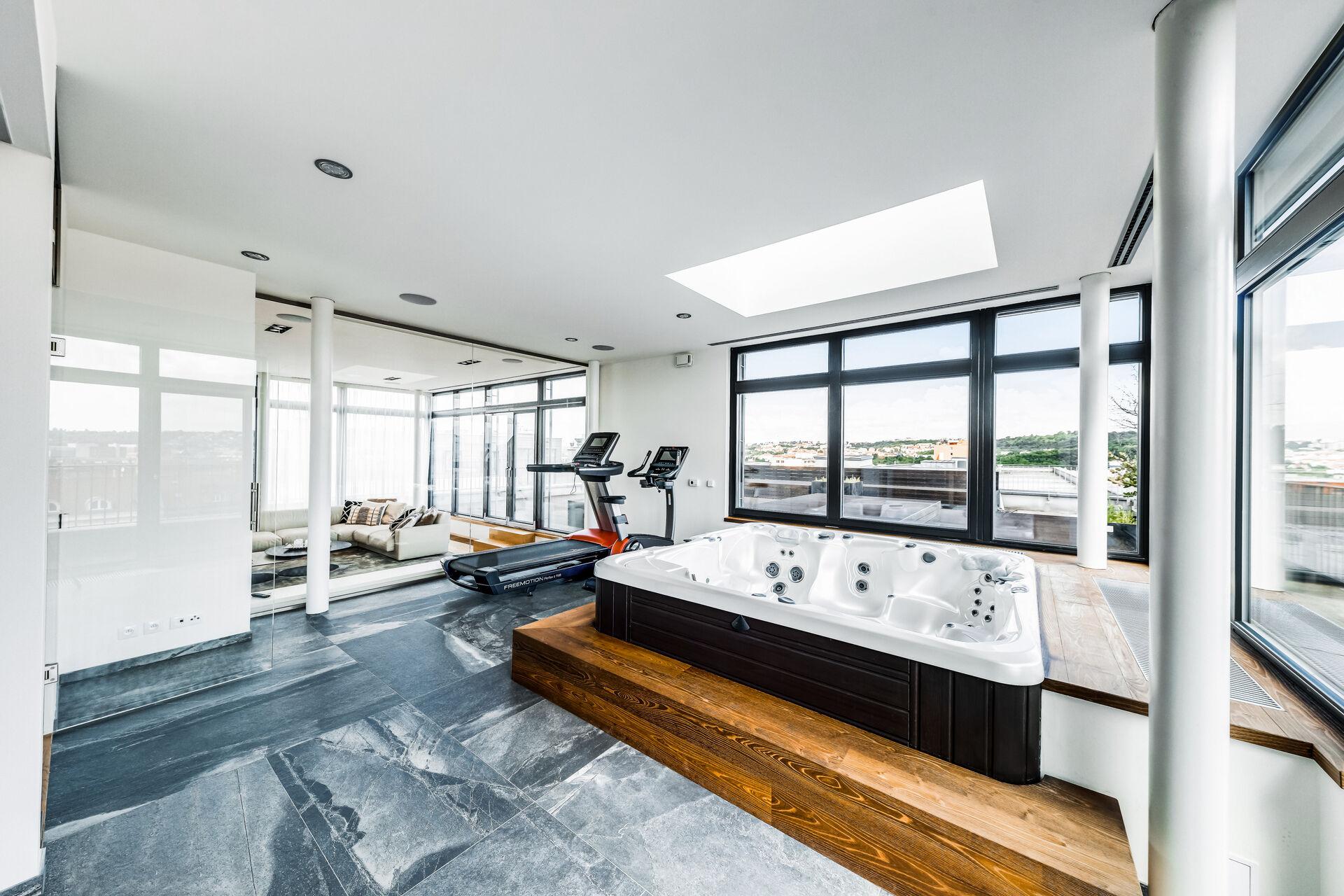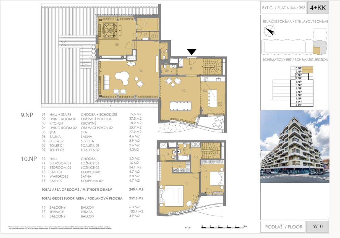 Dovolte mi nabídnout Vám k pronájmu nádherný zařízený střešní mezonetový byt typu penthouse v Praze 9 (roh ulic Ocelářská a Kurta Konráda) v úspěšném projektu Sedmikráska dokončeném v roce 2015. Klimatizovaný byt disponuje plochou o výměře 259m2. Celé spodní podlaží tvoří otevřenou entertainment zónu rozčleněnou na prostorný reprezentativní obývací pokoj, velkorysou jídelnu a kuchyň o celkové ploše 111m2, dále domácí fitness, které vám zajistí dokonalé pohodlí i soukromí. Pro relaxaci můžete využít wellness zónu s vířivkou a saunou. Celý obývací pokoj je prosklený a nabízí neopakovatelné výhledy do okolí. Terasa s výměrou přes 100m2 je ideálním místem pro pořádání společenských setkání a je dostatečně prostorná k vytvoření vlastní odpočinkové zóny. Schodiště odděluje část bytu s ložnicemi ve druhém podlaží, kde najdete dvě ložnice a dvě koupelny. Hlavní ložnice o výměře 34m2 disponuje koupelnou se sprchovým koutem a šatnou, k menší ložnici pak náleží koupelna s vanou přístupná z chodby. Ložnice mají společný balkon. Interiér tohoto jedinečného prostoru je navržen v moderním stylu s důrazem na kvalitu. Každý detail bytu je pečlivě promyšlený a byt je vybaven špičkovými materiály. K bytu náleží 3 parkovací místa v suterénu projektu. Nájemné 99.000 Kč/měsíc, zálohy na služby 16.000 Kč, přepis elektřiny na nájemníka, depozit 2 měsíční nájmy.