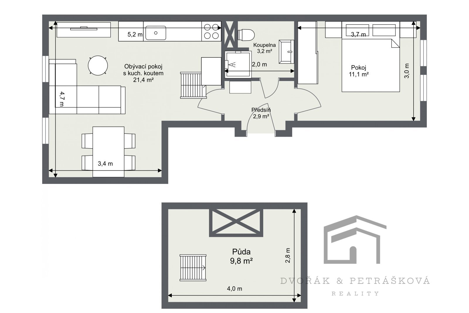 Realitní společnost Dvořák & Petrášková reality vám nabízí k pronájmu byt v osobním vlastnictví o dispozici 2+kk s půdním prostorem v pražské Libni, na adrese Pod Labuťkou 949/7. Neplatíte provizi RK. Zrekonstruovaný byt 2+kk s půdním prostorem, se nachází ve 3.patře cihlového domu BEZ výtahu. Byt prošel rekonstrukcí a je vhodný pro jednotlivce nebo pár. Bytová jednotka disponuje vstupní chodbou s oddělenými vstupy do jednotlivých pokojů. Obývací pokoj s kuchyňským koutem je vybavený myčkou, horkovzdušnou troubou, indukční varnou deskou, digestoří, dostatkem úložného prostoru a samostatně stojící lednicí s mrazákem. Součástí pronájmu je i veškerý nábytek na fotografiích. Výška stropu je 2,6 m2. Z obývacího pokoje je přístup na půdu, kterou lze využívat jako úložný prostor - zde jsou nízké stropy a chybí odvětrávání. Ložnice s přístupem z chodby je vybavena novou manželskou postelí a šatní skříní. Dále koupelna se sprchovým koutem, toaletou a připojením na pračku. Byt prošel kompletní rekonstrukcí a je volný k nastěhování. Součástí bytu není sklepní kóje. Parkování je možné před domem, na modrých zónách. Byt se nachází v blízkosti fakultní nemocnice Bulovka, kousek od domu je tramvajová zastávka U Kříže společně s kavárnou. Supermarket Albert je vzdálený 10 minut pěší chůzí. Nejbližší zastávky metra Palmovka nebo Prosek a OC Harfa s O2 arénou. Měsíční náklady na bydlení jsou: -nájemné 24.000,– Kč, -zúčtovatelné zálohy na služby pro 1 osobu cca 1.800,– Kč (přesná částka pro 2 osoby bude přepočítaná na základě nového evidenčního listu), -zálohy na odběr elektřiny cca 1.200,– Kč (smlouva na nájemce). Vratná kauce 48.000,– Kč, splatná při podpisu rezervační smlouvy. Nájemné na daný měsíc se hradí v daném měsíci. Neplatíte provizi. Byt je určený výhradně k dlouhodobému pronájmu a max. pro 2 osoby. Preferujeme nájemce bez domácích mazlíčků. Ráda se s Vámi uvidím na prohlídce.