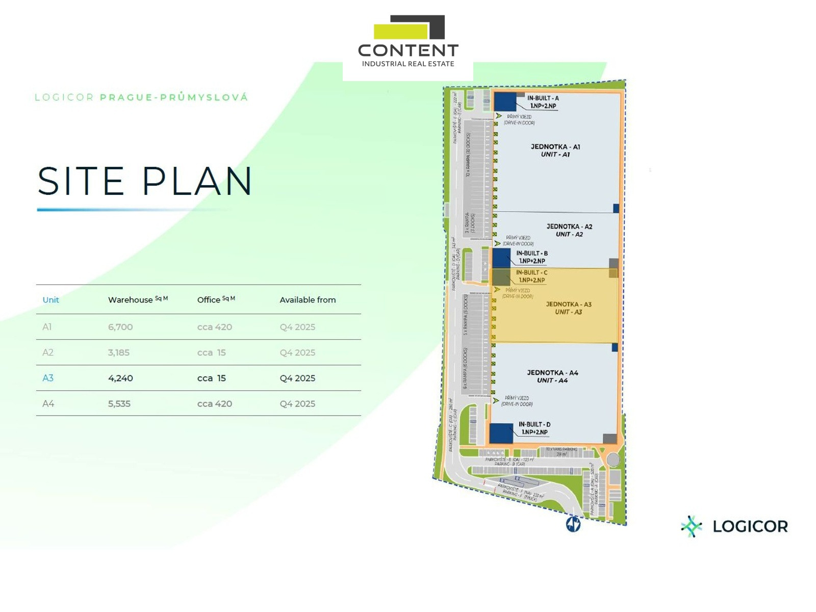 Pronájem skladu, výrobních prostor 5535 m² Praha 10 - Hostivař. V zastoupení majitele a bez provize nabízíme novostavbu komerčních prostor umístěných v rámci nového průmyslového areálu situovaného u Průmyslové ulice. Výjimečná nabídka moderních skladových nebo výrobních prostor v rámci širší Prahy, ideální pro zásobování města s výborným napojením u Jižní spojky na D1 a D11, D10. - samostatná část novostavby ihned k dispozici - nové bezprašné podlahy s minimální nosností 6 t/m² - hydraulické rampy a vjezdy v úrovni terénu - k pronájmu 2 samostatné sousedící jednotky 5535 m² (A4) a 4240 m² (A3), dohromady 9775 m² - světlá výška 12 m - sociální a kancelářské zázemí 420 m² (A4) - LED osvětlení - příjezd a manipulace TIR bezproblémové, ostraha - MHD, nádraží, cyklostezka blízko areálu Cena bude stanovena dle dalších podmínek smlouvy. Pro více informací nás kontaktujte.