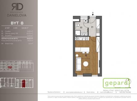 Nabízíme k pronájmu atraktivní byt v novostavbě o dispozici 1 + kk s venkovním parkovacím stáním a sklepem v přízemí domu, nacházející se na adrese Danielova, v části obce Čakovice, Praha 9. Podlahová plocha bytu činí 34,8 m2 + sklep o velikosti 1,11 m2. Přímo k bytu je vyhrazené venkovní parkovací stání před domem. Zakázková kuchyňská linka s vestavnými spotřebiči a lednicí, koupelnové vybavení a světla jsou již součástí pronájmu. Byt je situován v druhém nadzemním podlaží objektu o čtyřech podlaží a je přístupný bezbariérově, což zajišťuje pohodlné užívání pro všechny. Objekt je napojen na vodovod, kanalizaci a elektřinu. Vytápění je zajištěno centrálním dálkovým zdrojem, stejně jako ohřev teplé vody, což zajišťuje nízké náklady na energie a vysoký komfort bydlení. Dům je vybaven moderním výtahem. Poloha v klidné části Prahy 9 s veškerou občanskou vybaveností v blízkosti, jako jsou obchody, restaurace a služby, činí tuto nabídku velmi atraktivní pro jednotlivce i páry hledající moderní bydlení. Příjemné prostředí a dostupnost všech potřebných služeb zajišťují komfortní a spokojené bydlení v tomto novém bytě. Nájemné činí 17.500 Kč vč. parkovacího místa, kauce ve výši dvou měsíčních nájmů 35.000 Kč, zálohy na služby 2.500 Kč měsíčně, provize RK 20.000 Kč. Elektřina se převádí na nájemníka, zálohy za služby jsou zúčtovatelné. Byt je k dispozici od 1. 2. 2026 V případě zájmu o prohlídku nás neváhejte kontaktovat.