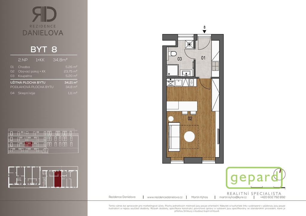 Nabízíme k pronájmu atraktivní byt v novostavbě o dispozici 1 + kk s venkovním parkovacím stáním a sklepem v přízemí domu, nacházející se na adrese Danielova, v části obce Čakovice, Praha 9. Podlahová plocha bytu činí 34,8 m2 + sklep o velikosti 1,11 m2. Přímo k bytu je vyhrazené venkovní parkovací stání před domem. Zakázková kuchyňská linka s vestavnými spotřebiči a lednicí, koupelnové vybavení a světla jsou již součástí pronájmu. Byt je situován v druhém nadzemním podlaží objektu o čtyřech podlaží a je přístupný bezbariérově, což zajišťuje pohodlné užívání pro všechny. Objekt je napojen na vodovod, kanalizaci a elektřinu. Vytápění je zajištěno centrálním dálkovým zdrojem, stejně jako ohřev teplé vody, což zajišťuje nízké náklady na energie a vysoký komfort bydlení. Dům je vybaven moderním výtahem. Poloha v klidné části Prahy 9 s veškerou občanskou vybaveností v blízkosti, jako jsou obchody, restaurace a služby, činí tuto nabídku velmi atraktivní pro jednotlivce i páry hledající moderní bydlení. Příjemné prostředí a dostupnost všech potřebných služeb zajišťují komfortní a spokojené bydlení v tomto novém bytě. Nájemné činí 16.900 Kč vč. parkovacího místa, kauce ve výši dvou měsíčních nájmů 33.800 Kč, zálohy na služby 2.500 Kč měsíčně, provize RK 20.000 Kč. Elektřina se převádí na nájemníka, zálohy za služby jsou zúčtovatelné. Byt je k dispozici od 1. 2. 2026 V případě zájmu o prohlídku nás neváhejte kontaktovat.
