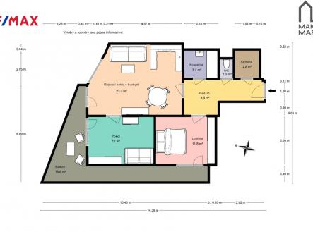 Nabízím k prodeji byt v osobním vlastnictví, nacházející se v Praze 5 – Zličín, ulice Sazovická. Celková výměra bytu činí 80,1 m², z toho balkon má velikost 15,8 m² a užitná plocha bytu je 64,3 m² dle prohlášení vlastníka. Byt se nachází v moderním bytovém domě 3 NP s výtahem a podzemním parkováním. V domě z roku 2009 je celkem 129 bytových jednotek Dispozice bytu je prakticky řešena a nabízí pohodlné bydlení. Podlahy v obytných místnostech jsou plovoucí, v koupelně je položena dlažba. Okna jsou plastová, stejně jako francouzská okna, která se nachází v obývacím pokoji i ložnici. Díky tomu je vstup na prostorný balkon možný z obou místností, což výrazně zvyšuje komfort bydlení a propojení interiéru s venkovním prostorem. Vytápění bytu je řešeno ústředním dálkovým topením, ohřev teplé vody je zajištěn centrálně dálkově v obývacím pokoji je klimatizace pro maximální pohodlí. Tyto systémy přinášejí stabilní provoz a jednoduchou správu bez nutnosti vlastní technologie v bytě. Součástí bytu je také komora, která plně nahrazuje sklepní kóji a poskytuje praktický úložný prostor přímo v bytě. Velkou výhodou je parkovací stání v přízemí domu, do kterého je zajištěn pohodlný vjezd. Lokalita Praha – Zličín patří mezi velmi dobře dostupné a vyhledávané části města. V blízkosti se nachází kompletní občanská vybavenost, obchodní centrum Metropole Zličín, školy, školky, lékaři i služby. Výborná je dopravní dostupnost – metro B Zličín, autobusové spoje i rychlé napojení na Pražský okruh a dálnici D5. Poplatky: FO: 1 300Kč, Voda: T 1 585, S 893 Kč, Teplo: 765 Kč, El 1 320 Kč Byt je vhodný jak pro vlastní bydlení, tak i jako investiční příležitost díky své poloze, dispozici a parkovacímu stání. Těším se na viděnou na prohlídce.