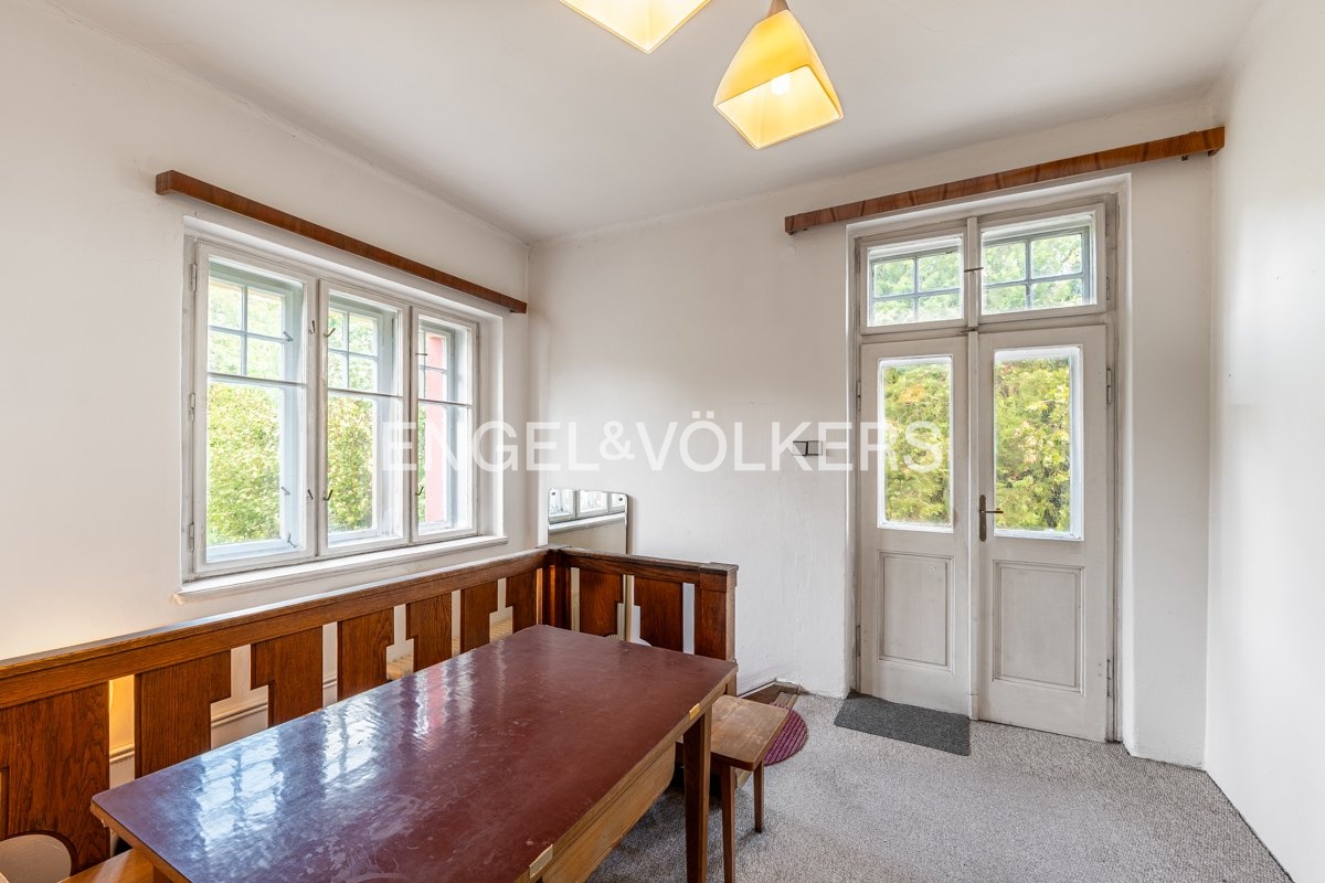 Polovina dvojdomu situovaná v klidné vilové čtvrti s výbornou dopravní dostupností nabízí unikátní příležitost k rodinnému či vícegeneračnímu bydlení v jedné z nejžádanějších pražských lokalit. Dům s nádhernými výhledy do okolí je součástí historického souboru vil vystavěných v letech 1923–1924 podle návrhu architekta Eduarda Hniličky ve stylu rondokubismu. Atmosféru doby dokládají zachované původní prvky – dřevěné parkety, špaletová okna a charakteristické architektonické detaily. Dispozice domu je rozložena do tří podlaží. V polosuterénním podlaží se nacházejí dvě ložnice, pracovna, dílna a technická místnost. Vstupní podlaží tvoří srdce domu – prostorný obývací pokoj, kuchyně s jídelnou, spíž a komora, dále ložnice orientovaná do klidné zahrady, koupelna a samostatná toaleta. Z kuchyně je přímý vstup na jižně orientovanou terasu. První patro nabízí kuchyni, obývací pokoj, dvě ložnice, koupelnu a balkon s výhledem do zeleně. Nad obytnou částí se rozkládá velkorysá půda s vysokým krovem, která dosud nebyla využita a nabízí možnost vestavby dalšího obytného prostoru. Dům prošel izolací základů a drenáží po celém obvodu, díky čemuž je polosuterén suchý a plně obytný. Před cca 20 lety proběhla částečná rekonstrukce elektroinstalace, topení, vody, stoupaček a kuchyní. Vytápění zajišťují plynové kotle, ohřev vody bojler. Na pozemku se nacházejí dvě garáže s kapacitou až pro 4 automobily. Strop garáže je naddimenzován a připraven pro případnou nástavbu. Oblast zvaná Šumava je vyhledávanou vilovou čtvrtí s vynikající dostupností do centra města i do přírody. V okolí se nachází školy, školky, parky, sportoviště i oblíbené kavárny a restaurace.