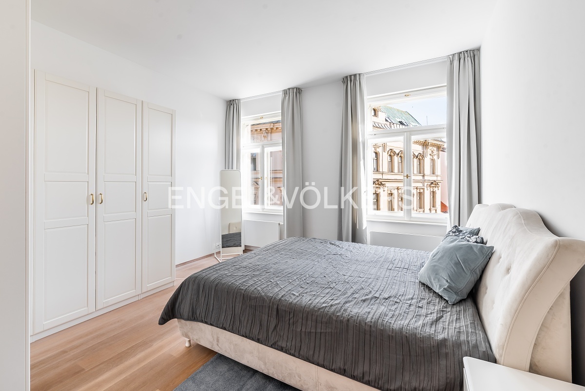 K pronájmu je připravený světlý byt s dispozicí 3+kk nacházející se v pátém nadzemním podlaží činžovního domu s výtahem. Praktické rozložení tohoto bytu nabízí vstupní místnost, ložnici orientovanou do klidného vnitrobloku, koupelnu se sprchou, toaletou a bidetem, prostorný obývací pokoj s kompletně vybavenou kuchyní včetně myčky a vestavěné lednice. Druhá ložnice je s okny do ulice Jungmannova a s en suite koupelnou včetně toalety a vany. Zálohy za služby spojené s užíváním bytu činí 6 500 Kč, elektřina se převádí na nájemce. Kauce dva měsíční nájmy. Provize za zprostředkování jeden měsíční nájem plus DPH.