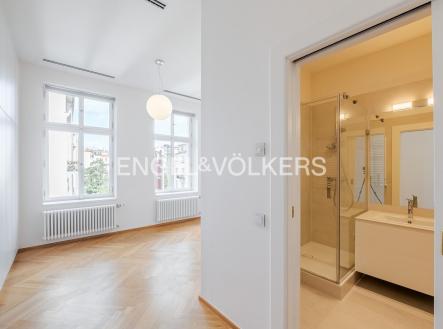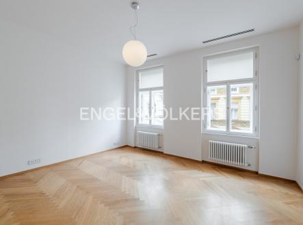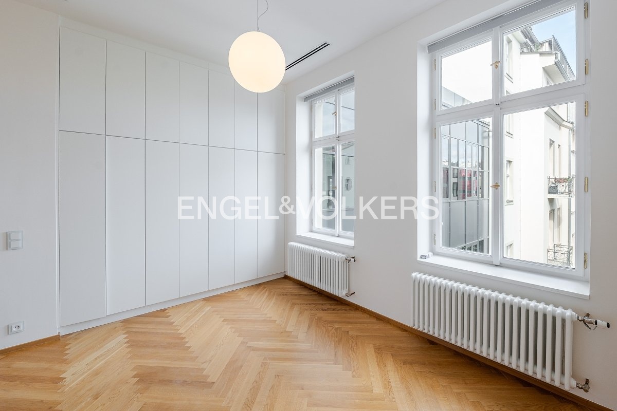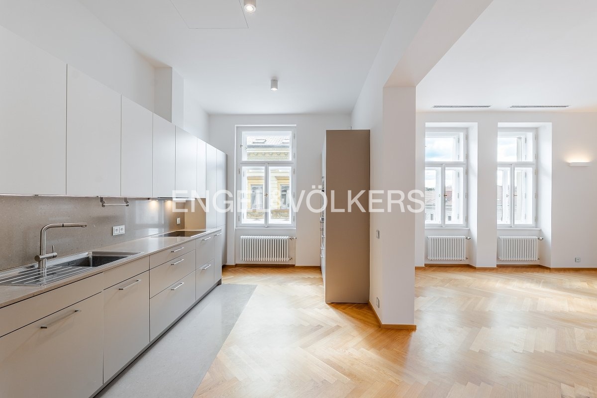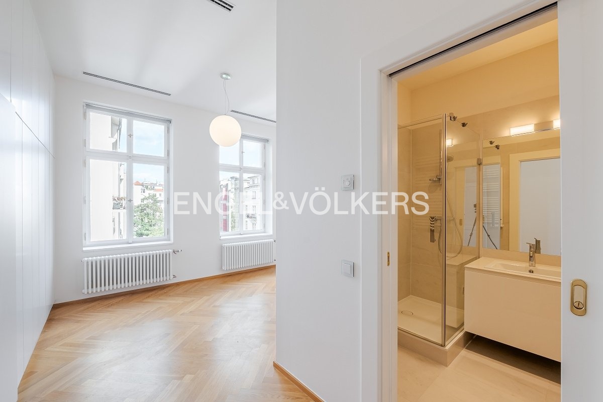 Nadstandardní byt se nachází v 5. nadzemním podlaží secesního činžovního domu z konce 19. století, který nyní prošel kompletní rekonstrukcí. Byt s praktickou dispozicí se třemi ložnicemi, dvěma koupelnami a velkorysým obývacím pokojem s kuchyní. Kuchyňská linka SieMatic se spotřebiči Miele (od firmy STOPKA). V celém bytě jsou kvalitní dubové podlahy, příjemnou teplotu zajišťuje stropní chlazení a vytápění, dostatek úložných prostor díky vestavěným skříním. Luxusní rezidence s recepcí 24/7, ostrahou, kamerovým systémem, výtahem, upraveným vnitroblokem a sklepem. Pro budoucí nájemníky je k dispozici wellness se saunou, bazénem a fitness. Možnost pronájmu parkovacího stání v garáži. Bezpečnost kromě ostrahy zaručuje i kompletní inteligentní systém zabezpečení vč. domácího videotelefonu. Fotografie jsou pouze ilustrativní. Záloha na poplatky za domovní služby a vodu 130 Kč/m2 měsíčně. Plyn a elektřina - převod na nájemce.