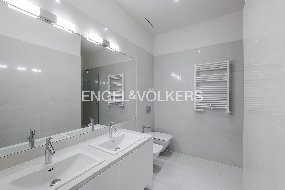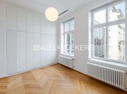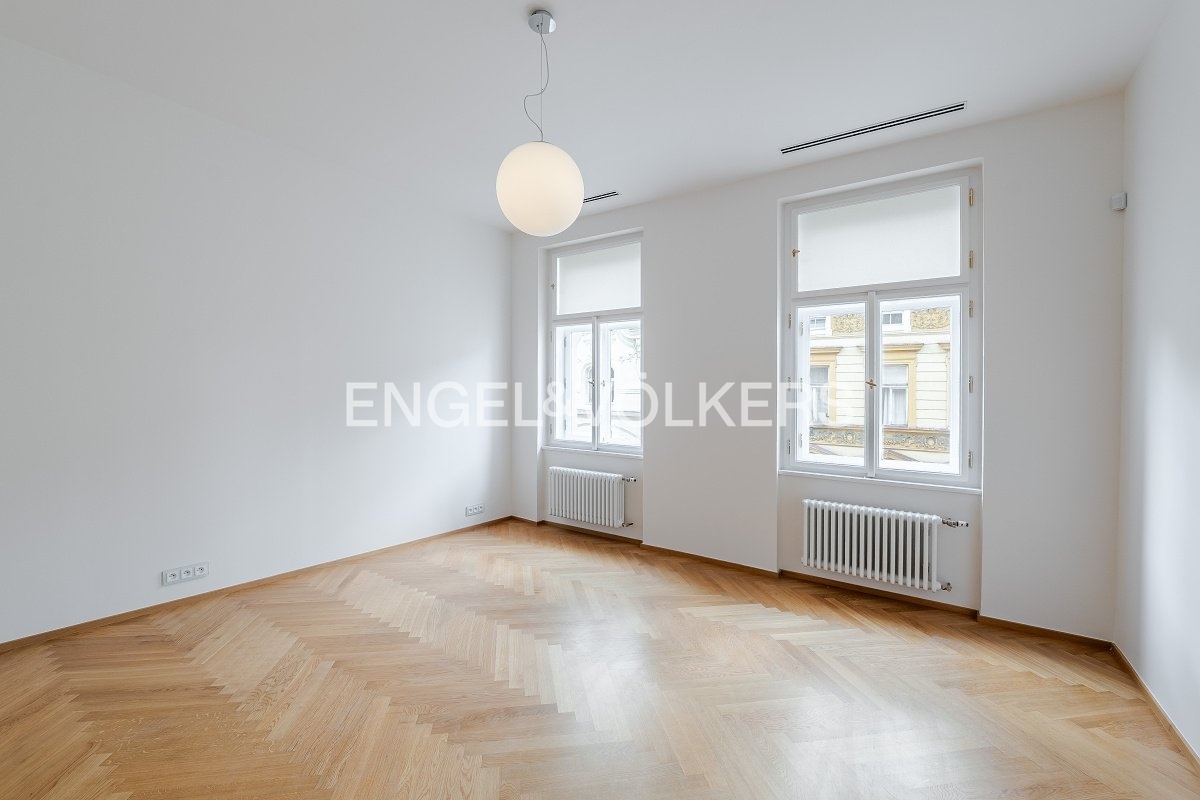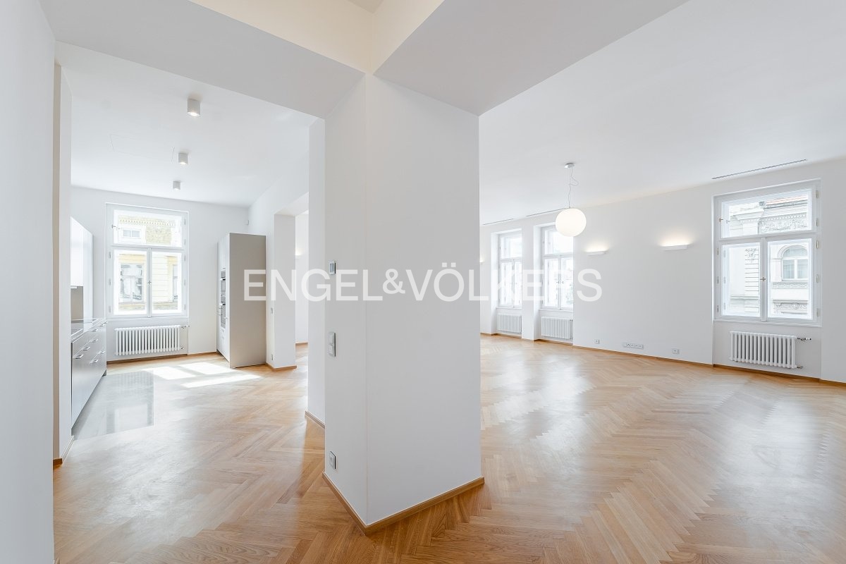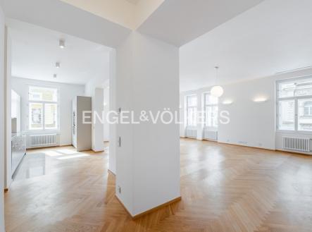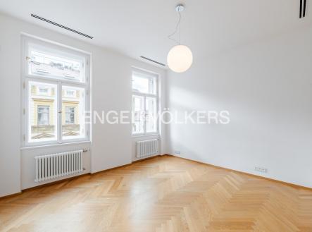 Nadstandardní byt se nachází v 5. nadzemním podlaží secesního činžovního domu z konce 19. století, který nyní prošel kompletní rekonstrukcí. Byt s praktickou dispozicí se třemi ložnicemi, dvěma koupelnami a velkorysým obývacím pokojem s kuchyní. Kuchyňská linka SieMatic se spotřebiči Miele (od firmy STOPKA). V celém bytě jsou kvalitní dubové podlahy, příjemnou teplotu zajišťuje stropní chlazení a vytápění, dostatek úložných prostor díky vestavěným skříním. Luxusní rezidence s recepcí 24/7, ostrahou, kamerovým systémem, výtahem, upraveným vnitroblokem a sklepem. Pro budoucí nájemníky je k dispozici wellness se saunou, bazénem a fitness. Možnost pronájmu parkovacího stání v garáži. Bezpečnost kromě ostrahy zaručuje i kompletní inteligentní systém zabezpečení vč. domácího videotelefonu. Fotografie jsou pouze ilustrativní. Záloha na poplatky za domovní služby a vodu 130 Kč/m2 měsíčně. Plyn a elektřina - převod na nájemce.