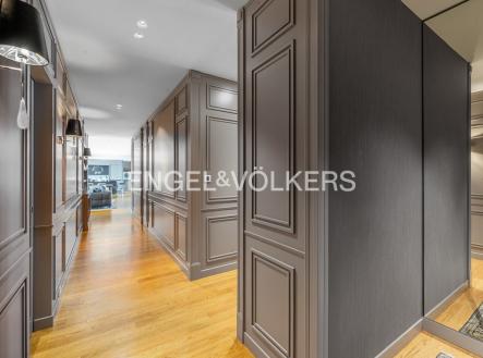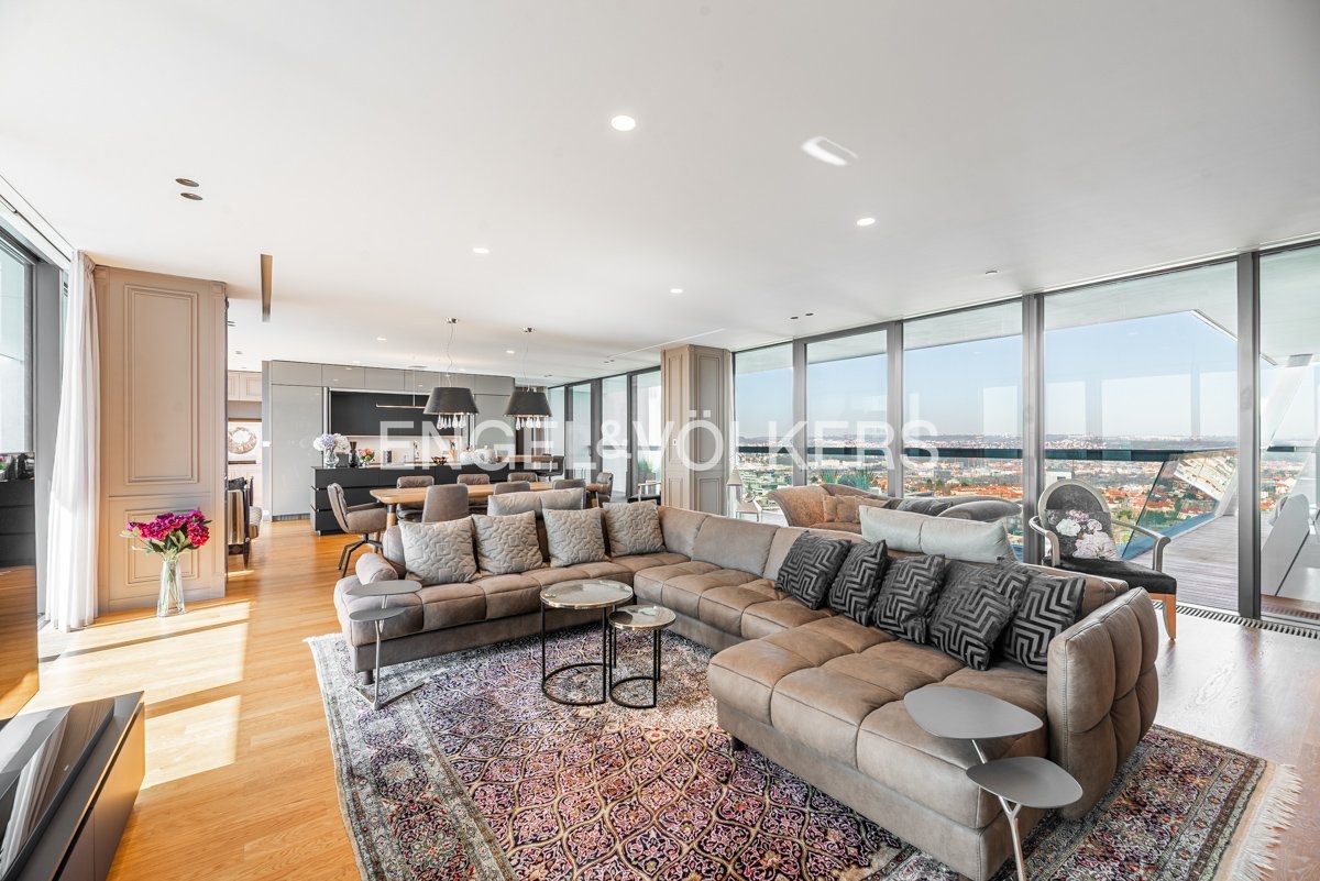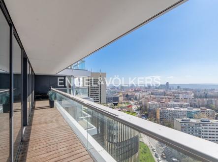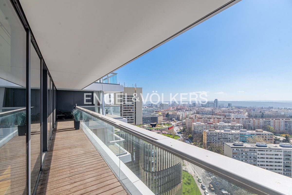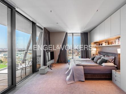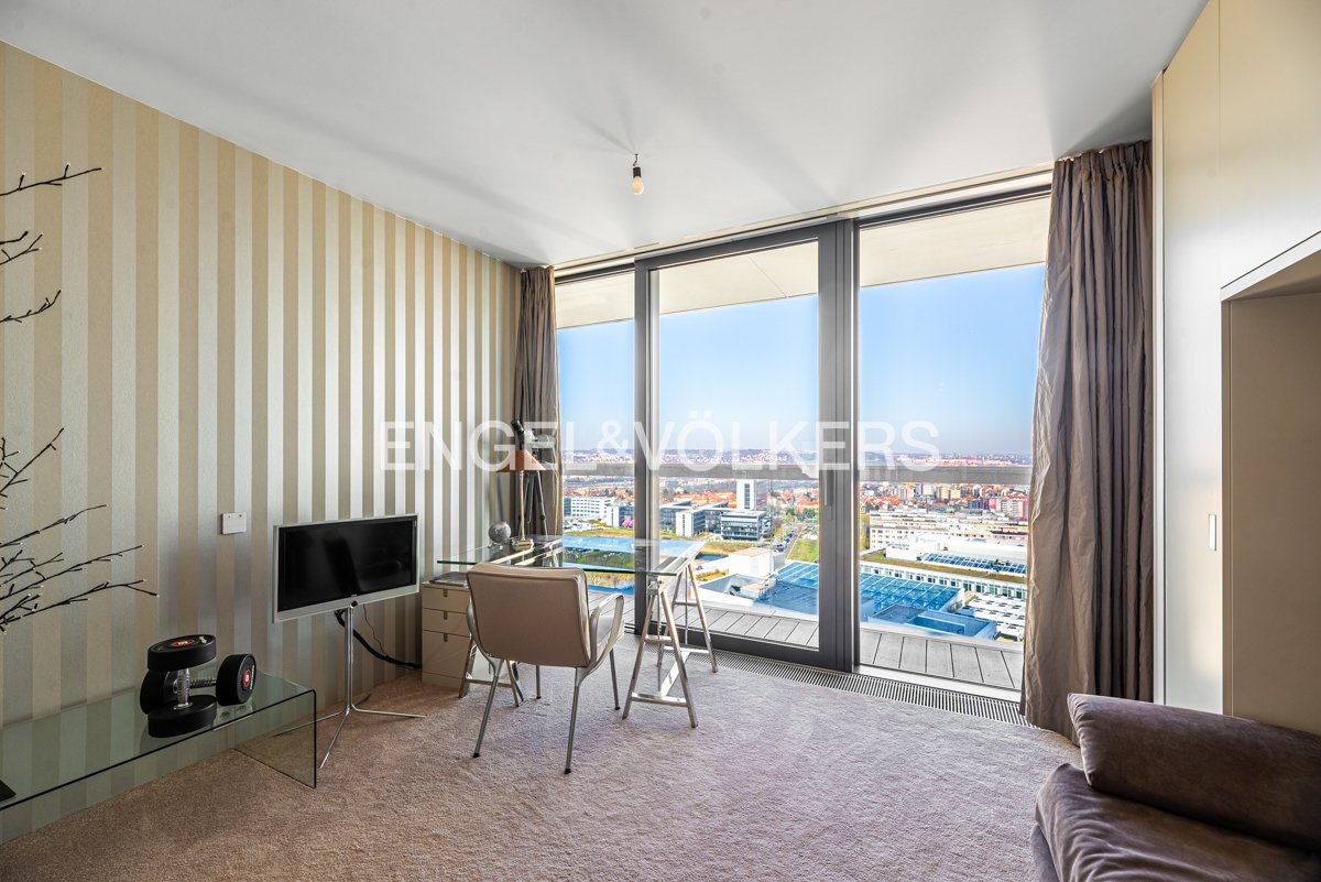 Představujeme Vám výjimečný byt v ikonické luxusní rezidenci V Tower z roku 2018, která se díky originálnímu architektonickému pojetí studia Radana Hubičky stala nejznámější výškovou budovou v Praze, oceněnou řadou prestižních architektonických cen. Byt se nachází v horní části domu, v 19. nadzemním podlaží, a nabízí jedinečné výhledy na panorama Prahy, Pražský hrad, Vyšehrad i historické centrum města. Dispozice 4+kk s vnitřní užitnou plochou 234 m² je velmi promyšlená a praktická. Ze vstupní chodby je přímý přístup do všech místností, což zajišťuje komfortní každodenní fungování. Byt je převážně orientován severozápadním směrem na centrum Prahy, přičemž obývací pokoj má zároveň jihovýchodní orientaci a je po obou stranách propojen se dvěma terasami o velikosti 41 m² a 24 m², které poskytují výjimečný prostor pro relaxaci s dechberoucími výhledy. Na patře se nacházejí pouze dva byty, což zaručuje maximální soukromí. Hlavní ložnice disponuje vlastní šatnou a en-suite koupelnou s vanou a sprchou, další dvě ložnice mají k dispozici sdílenou koupelnu se sprchovým koutem. Součástí bytu je také samostatná šatna, technická místnost a oddělená toaleta. Interiér je kompletně vybaven ve vysokém standardu, zahrnujícím dubové podlahy, kamenné obklady Bianco Carrara, hliníková okna s trojskly a elektrickými roletami, podlahové vytápění Jaga, stropní chlazení Clina a rekuperační systém Atrea. Koupelny jsou osazeny značkami Hansgrohe, Kaldewei a Villeroy & Boch. Rezidence nabízí moderní energeticky úsporné technologie, výborný akustický komfort a nadstandardní zázemí pro rezidenty. K dispozici je exkluzivní klubové patro s fitness centrem, bazénem, vířivkou, saunou, konferenčními místnostmi a dětským koutkem, dále privátní kino a golfový trenažér. Samozřejmostí je 24hodinová recepce s concierge službami hotelového typu. K bytu náleží dvě uzamykatelná garážová stání v podzemní garáži a dva sklepy. Tento byt představuje jedinečné spojení luxusu a soukromí v jedné z nejexkluzivnějších rezidencí v Praze.