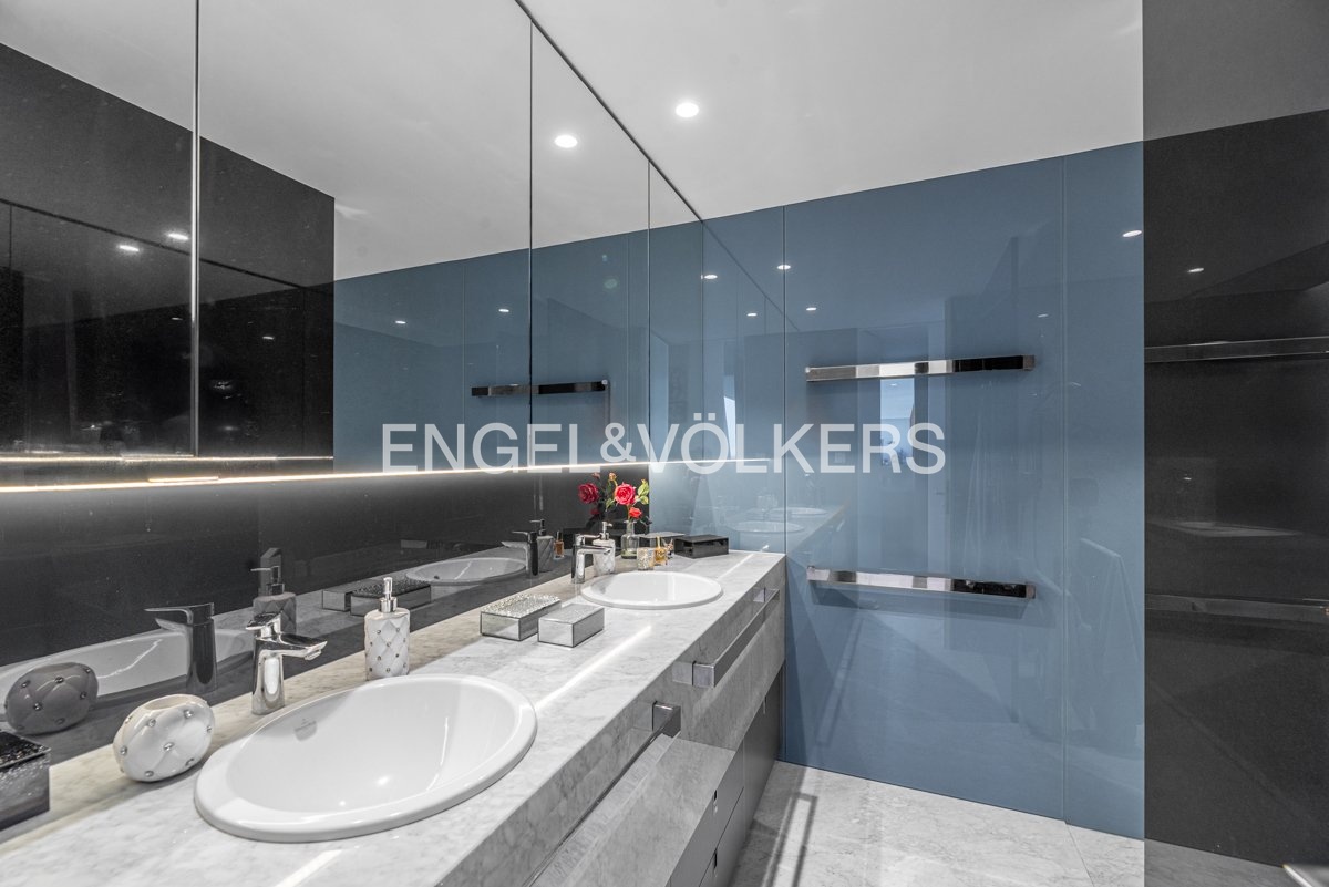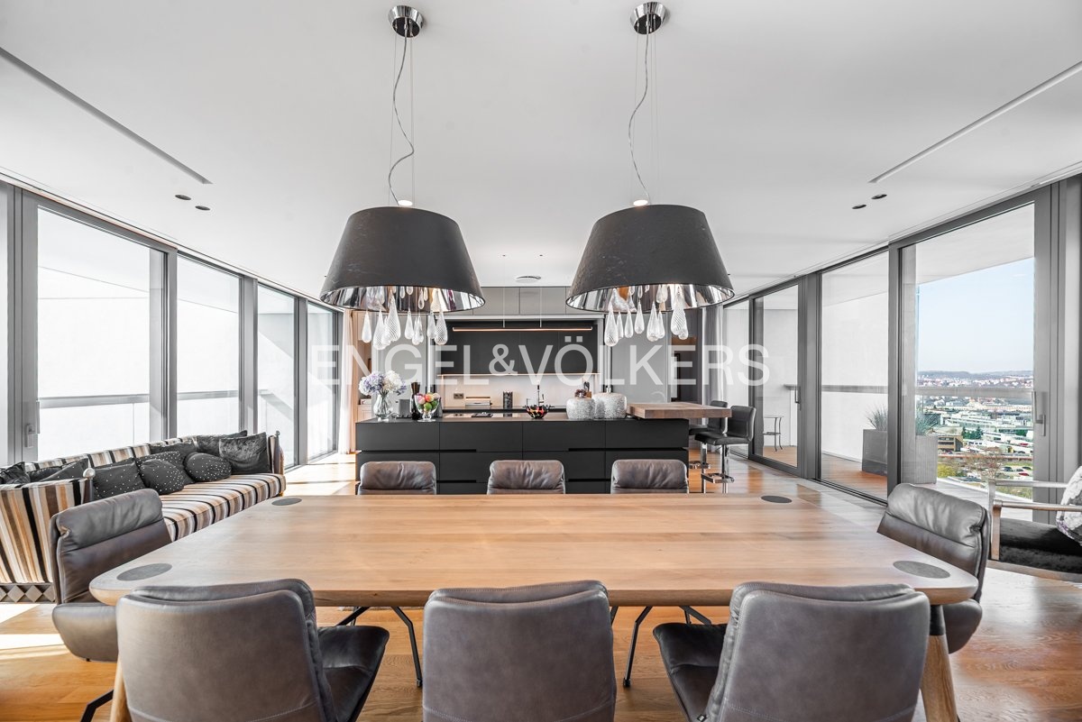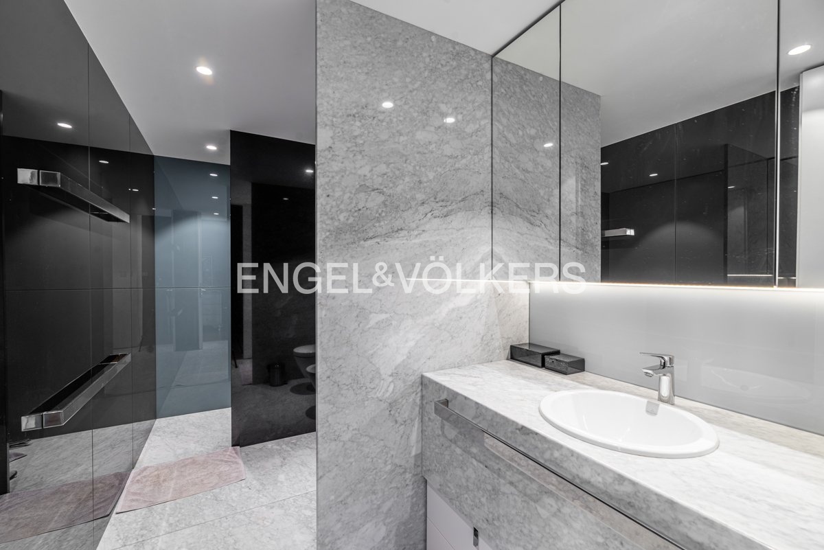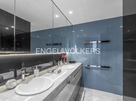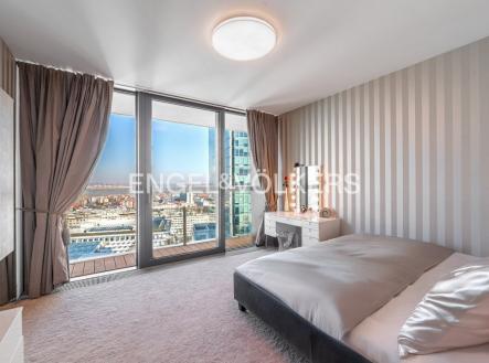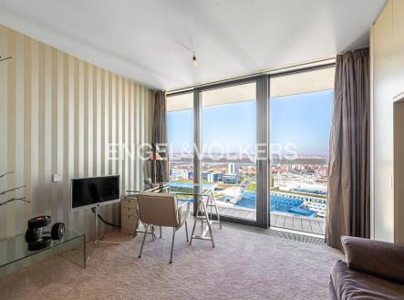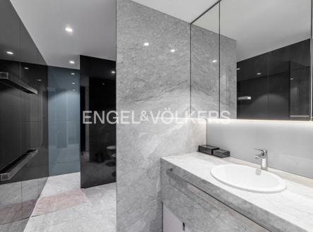 Představujeme Vám výjimečný byt v ikonické luxusní rezidenci V Tower z roku 2018, která se díky originálnímu architektonickému pojetí studia Radana Hubičky stala nejznámější výškovou budovou v Praze, oceněnou řadou prestižních architektonických cen. Byt se nachází v horní části domu, v 19. nadzemním podlaží, a nabízí jedinečné výhledy na panorama Prahy, Pražský hrad, Vyšehrad i historické centrum města. Dispozice 4+kk s vnitřní užitnou plochou 234 m² je velmi promyšlená a praktická. Ze vstupní chodby je přímý přístup do všech místností, což zajišťuje komfortní každodenní fungování. Byt je převážně orientován severozápadním směrem na centrum Prahy, přičemž obývací pokoj má zároveň jihovýchodní orientaci a je po obou stranách propojen se dvěma terasami o velikosti 41 m² a 24 m², které poskytují výjimečný prostor pro relaxaci s dechberoucími výhledy. Na patře se nacházejí pouze dva byty, což zaručuje maximální soukromí. Hlavní ložnice disponuje vlastní šatnou a en-suite koupelnou s vanou a sprchou, další dvě ložnice mají k dispozici sdílenou koupelnu se sprchovým koutem. Součástí bytu je také samostatná šatna, technická místnost a oddělená toaleta. Interiér je kompletně vybaven ve vysokém standardu, zahrnujícím dubové podlahy, kamenné obklady Bianco Carrara, hliníková okna s trojskly a elektrickými roletami, podlahové vytápění Jaga, stropní chlazení Clina a rekuperační systém Atrea. Koupelny jsou osazeny značkami Hansgrohe, Kaldewei a Villeroy & Boch. Rezidence nabízí moderní energeticky úsporné technologie, výborný akustický komfort a nadstandardní zázemí pro rezidenty. K dispozici je exkluzivní klubové patro s fitness centrem, bazénem, vířivkou, saunou, konferenčními místnostmi a dětským koutkem, dále privátní kino a golfový trenažér. Samozřejmostí je 24hodinová recepce s concierge službami hotelového typu. K bytu náleží dvě uzamykatelná garážová stání v podzemní garáži a dva sklepy. Tento byt představuje jedinečné spojení luxusu a soukromí v jedné z nejexkluzivnějších rezidencí v Praze.