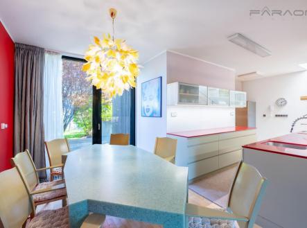 Prodej solitérní, podsklepené třípodlažní vily 4+kk (278,1 m²) železobetonové konstrukce, která je součástí uzavřeného a bezpečného areálu s 24/7 recepcí a ostrahou, který zajišťuje maximální soukromí a klid v prestižním a oceňovaném rezidenčním projektu Na Krutci v Praze 6 – Vokovicích v pěším dosahu Šáreckého údolí. Nadčasová architektura vily je dílem renomovaného studia KUBA & PILAŘ architekti. I přes kompaktní velikost nabízí pozemek kolem vily krásně upravenou zahradu s pečlivě vybranou vzrostlou zelení, která příjemně doplňuje architekturu domu a poskytuje pocit soukromí i zeleného rámce pro každodenní bydlení. Zahrada je navržena s důrazem na estetiku i funkčnost a vytváří útulný prostor pro posezení, odpočinek či drobné zahradničení. Její upravený charakter dodává vile harmonický a reprezentativní dojem. Mimořádně atraktivní lokalita nabízí výjimečné propojení městského komfortu s přírodou – v docházkové vzdálenosti se nachází přírodní rezervace Šárecké údolí a jen pár minut chůze je stanice metra A – Nádraží Veleslavín, díky čemuž je centrum města snadno a rychle dostupné. Rezidenti mohou využívat soukromé relaxační centrum se širokou nabídkou služeb: virtuální golf, fitness, wellness, tenisové kurty či restauraci s letní zahrádkou. Vila se rozkládá ve třech podlažích a nabízí promyšlené a velkorysé uspořádání pro pohodlné rodinné bydlení. Vstupní (přízemní) podlaží tvoří zádveří se šatnou, samostatná toaleta pro hosty s umyvadlem a prostorný obývací pokoj propojený s jídelní částí a kuchyní. Z obývací zóny je přímý vstup na hlavní terasu orientovanou do soukromé zeleně, která poskytuje klid a intimitu. Druhá terasa navazující na jídelnu slouží jako příjemné místo pro venkovní posezení. První (horní) podlaží představuje privátní obytnou část domu – dvě komfortní ložnice, dvě koupelny (jedna s vanou) a prostorná terasa, která nabízí klidné zázemí s výhledem do zeleně. Suterénní podlaží je výjimečně prostorné a funkčně navržené. Najdete zde technické zázemí domu (prádelna, žehlírna, sklad), samostatný pokoj pro hosty a velkou místnost využitelnou jako šatna či hobby místnost. Součástí je také přímý vstup do garáže. Vila je vybavena kuchyňskou linkou na míru se zabudovanými spotřebiči, dřevěnými okny s izolačními skly a kvalitním plynovým kondenzačním, turbo kotel zn.Buderus zajišťujícím úsporné vytápění. Interiér nabízí dostatek úložných prostor díky praktickým vestavěným skříním na míru, které elegantně doplňují celkový design domu. Součástí prodeje je rovněž kompletní vybavení dle aktuální fotodokumentace. Komfortní parkování je zajištěno prostornou garáží přímo v suterénu domu, která poskytuje bezpečné a pohodlné zázemí. Díky uzavřenému a dobře organizovanému charakteru celého rezidenčního areálu je navíc možné bez problémů zaparkovat také přímo před domem, což zajišťuje flexibilitu pro návštěvy i každodenní provoz. Tato výjimečná nemovitost představuje ojedinělou příležitost pro ty, kteří hledají nadstandardní rodinné bydlení v prestižní a bezpečné lokalitě. Nabízí kombinaci nadčasové architektury, praktického uspořádání, upravené zahrady a komfortního zázemí. Bonusem je uzavřený areál s možností sportovního a relaxačního vyžití v bezprostřední blízkosti domu – od tenisu přes fitness až po restauraci s letní zahrádkou. Info o ceně u makléře RK. Poplatky za správu 2 508,- + energie