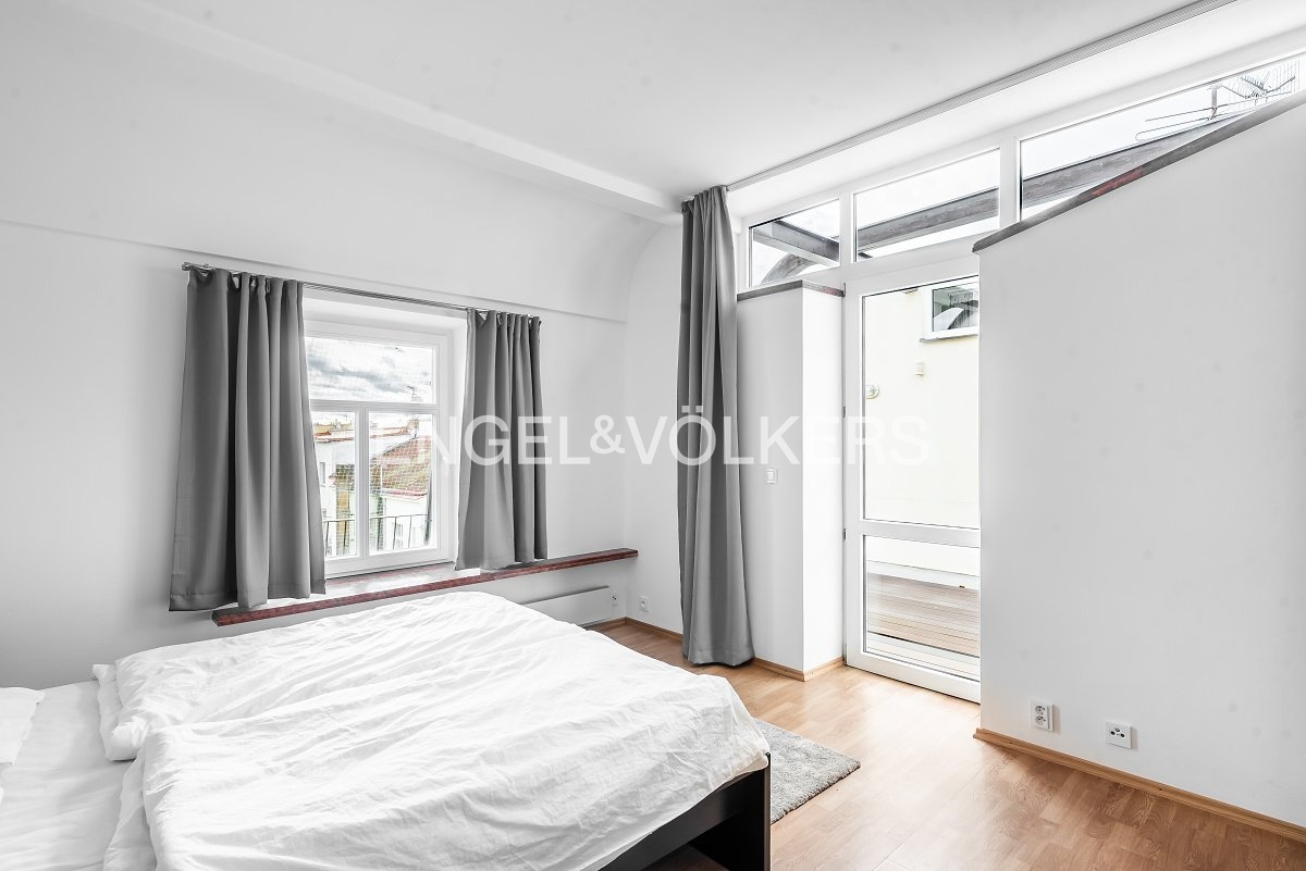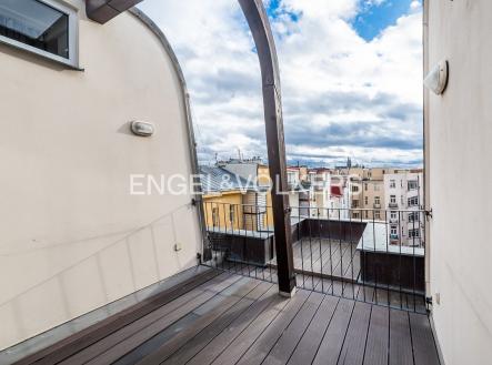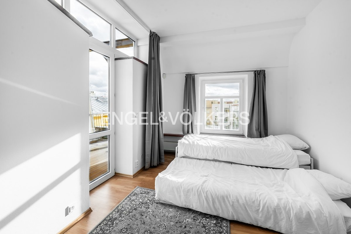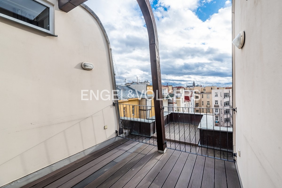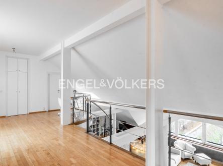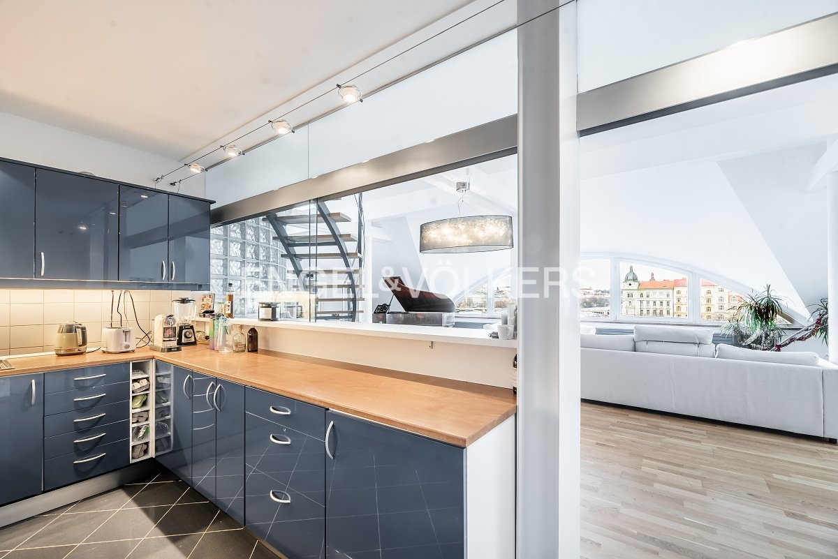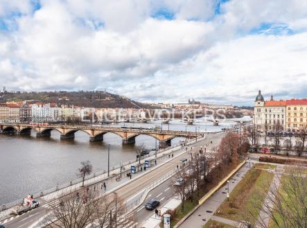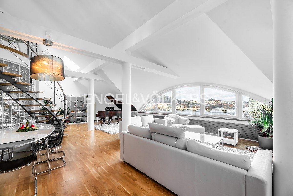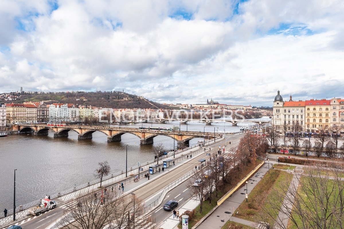 Moderní a vzdušný mezonet situovaný v nejvyšším podlaží historického činžovního domu na Rašínově nábřeží poskytující nepopsatelné výhledy na Vltavu a Hradčany. Díky velkým proskleným plochám je apartmán velmi světlý. Srdcem bytu je prostorný obývací pokoj propojený s galerií ve vyšším podlaží. Kuchyně je oddělená a kompletně zařízená vestavěnými spotřebiči. Apartmán má 4 ložnice, z nichž 3 jsou situovány v patře, v klidové zóně mezonetu. Tři koupelny, každá s vanou sprchovým koutem a bidetem. Terasa je orientovaná do klidného vnitrobloku a navazuje na zimní zahradu. Dřevěná podlaha, kvalitní dřevěná okna, dlažba. V domě je výtah. K bytu náleží jedno parkovací místo v garáži. Byt se pronajímá kompletně vybavený.