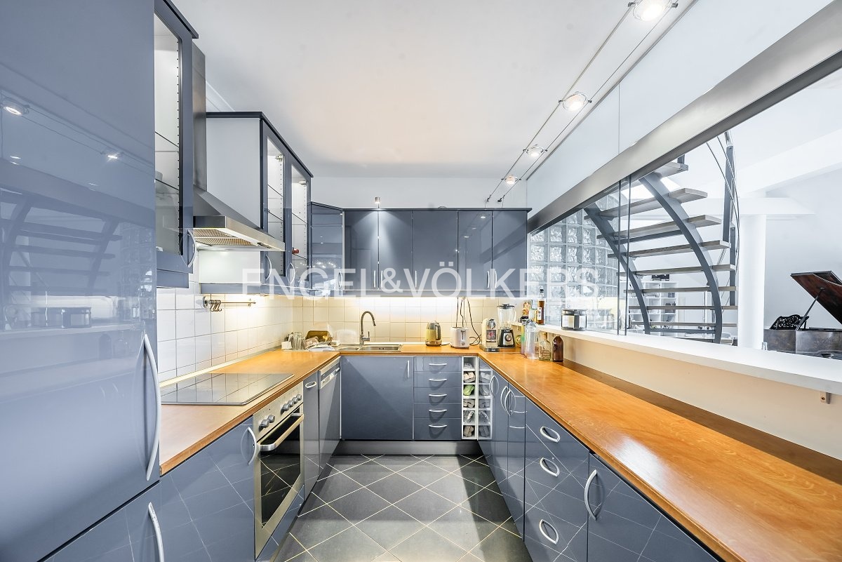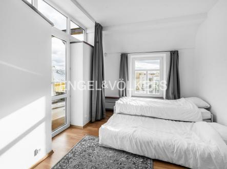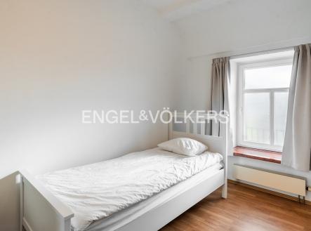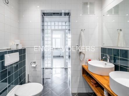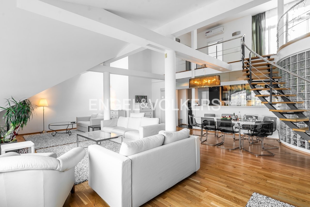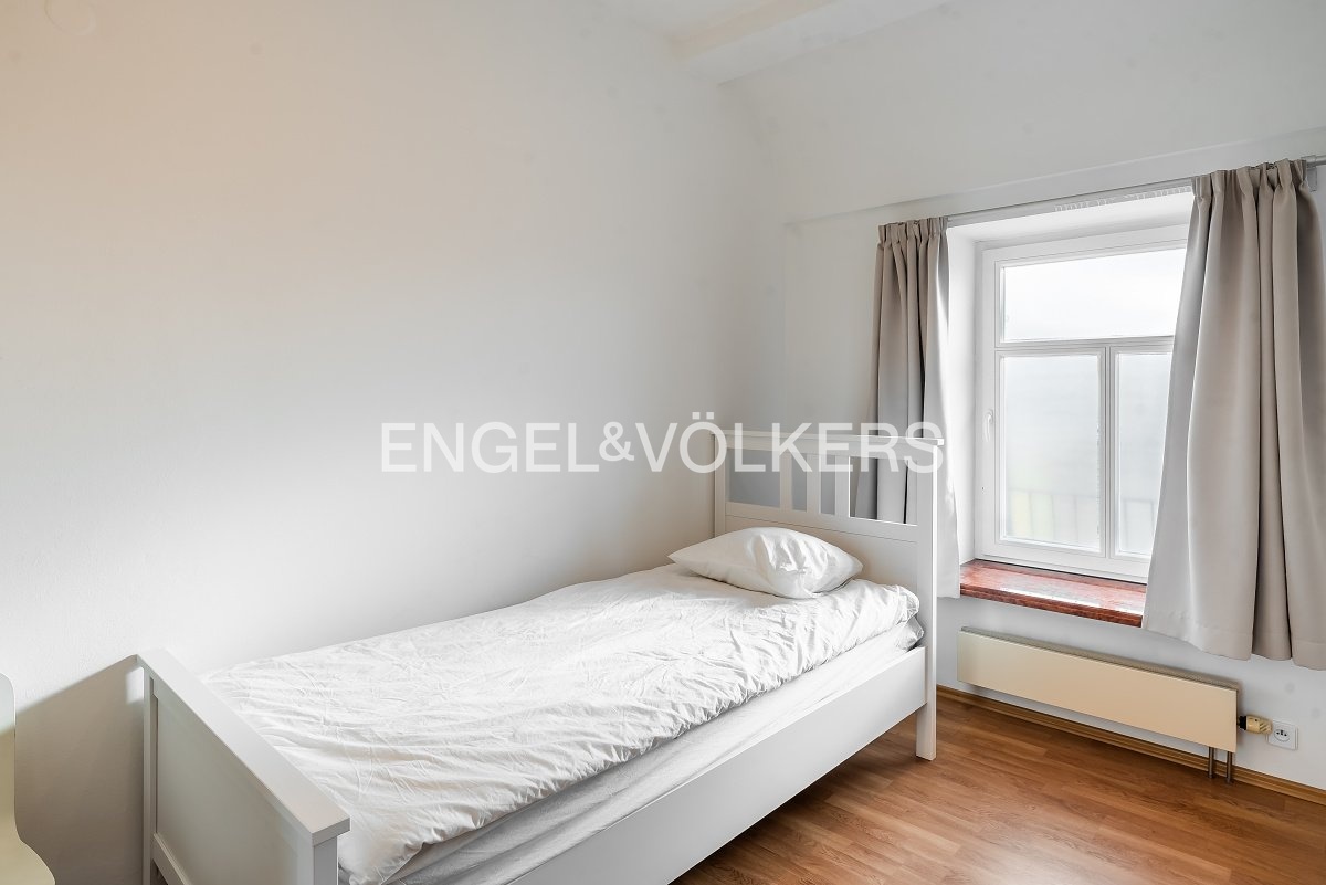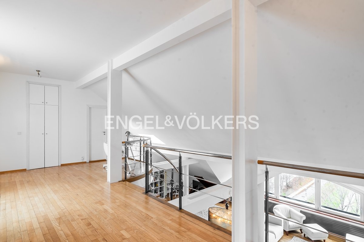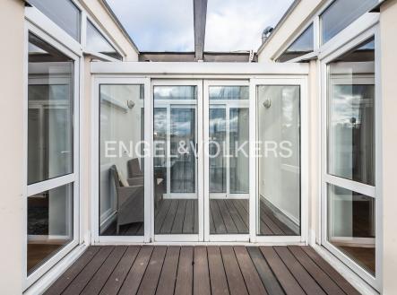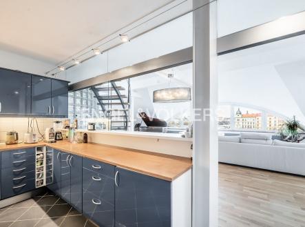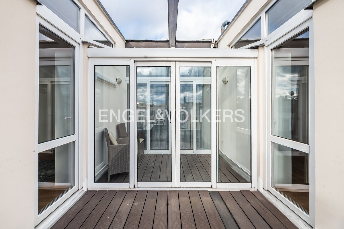 Moderní a vzdušný mezonet situovaný v nejvyšším podlaží historického činžovního domu na Rašínově nábřeží poskytující nepopsatelné výhledy na Vltavu a Hradčany. Díky velkým proskleným plochám je apartmán velmi světlý. Srdcem bytu je prostorný obývací pokoj propojený s galerií ve vyšším podlaží. Kuchyně je oddělená a kompletně zařízená vestavěnými spotřebiči. Apartmán má 4 ložnice, z nichž 3 jsou situovány v patře, v klidové zóně mezonetu. Tři koupelny, každá s vanou sprchovým koutem a bidetem. Terasa je orientovaná do klidného vnitrobloku a navazuje na zimní zahradu. Dřevěná podlaha, kvalitní dřevěná okna, dlažba. V domě je výtah. K bytu náleží jedno parkovací místo v garáži. Byt se pronajímá kompletně vybavený.
